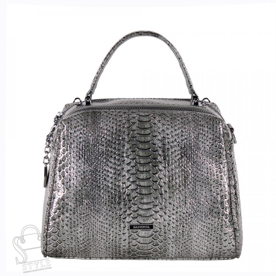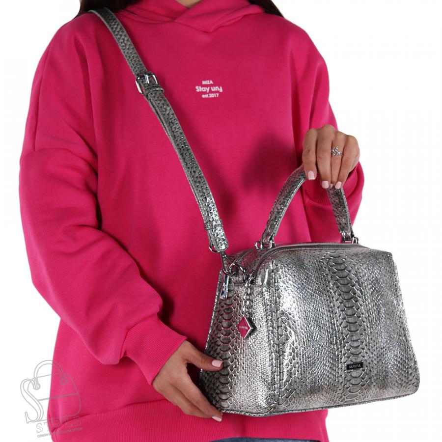 Эффектная модель с перламутровым эффектом, выполнена из экокожи. Дополнена серебристой фурнитурой. Данная модель закрывается на молнию. Каркас полужесткий. Сумка носится за ручки или за плечевой ремень на плече.