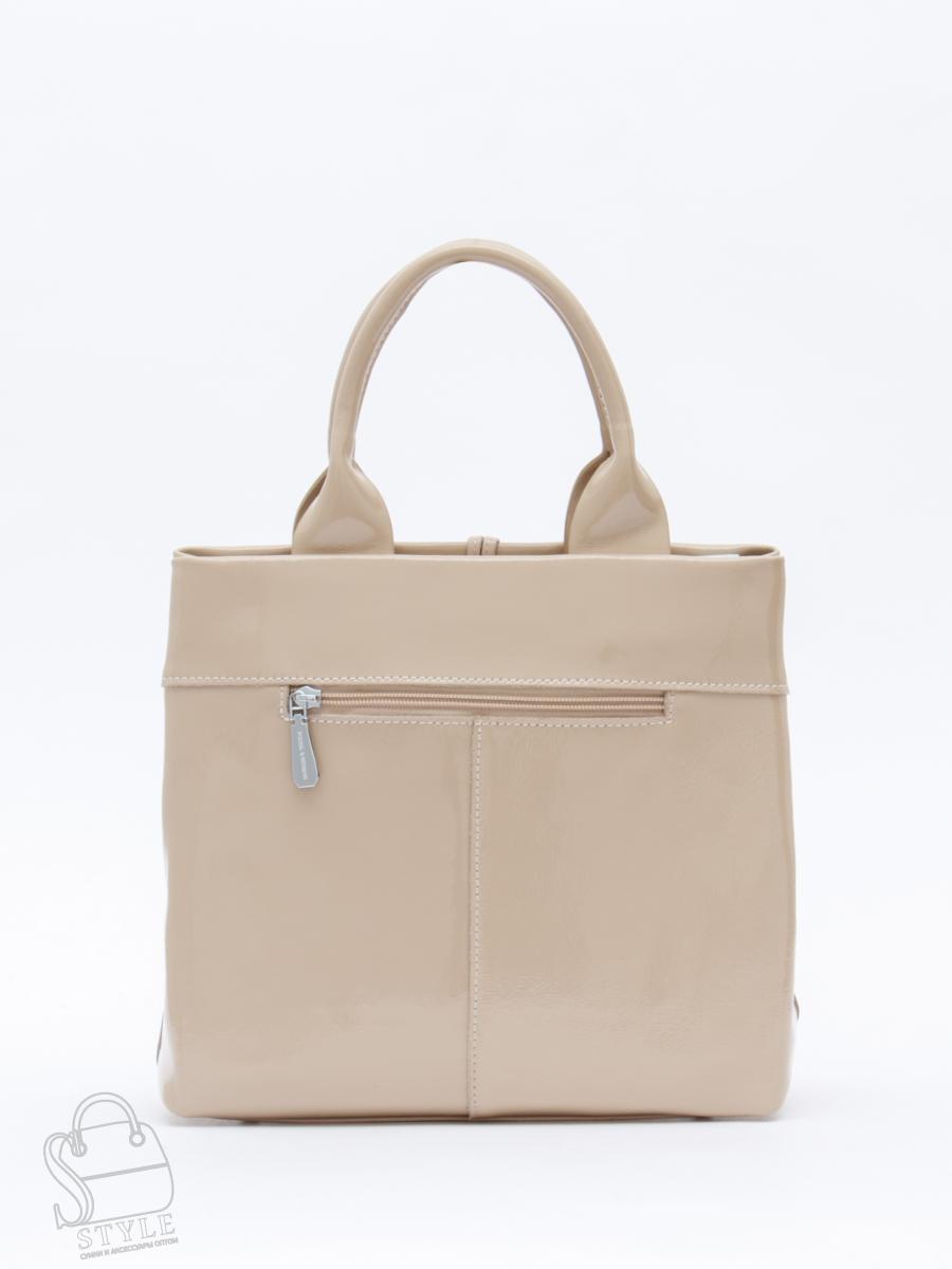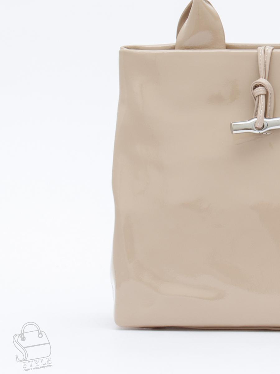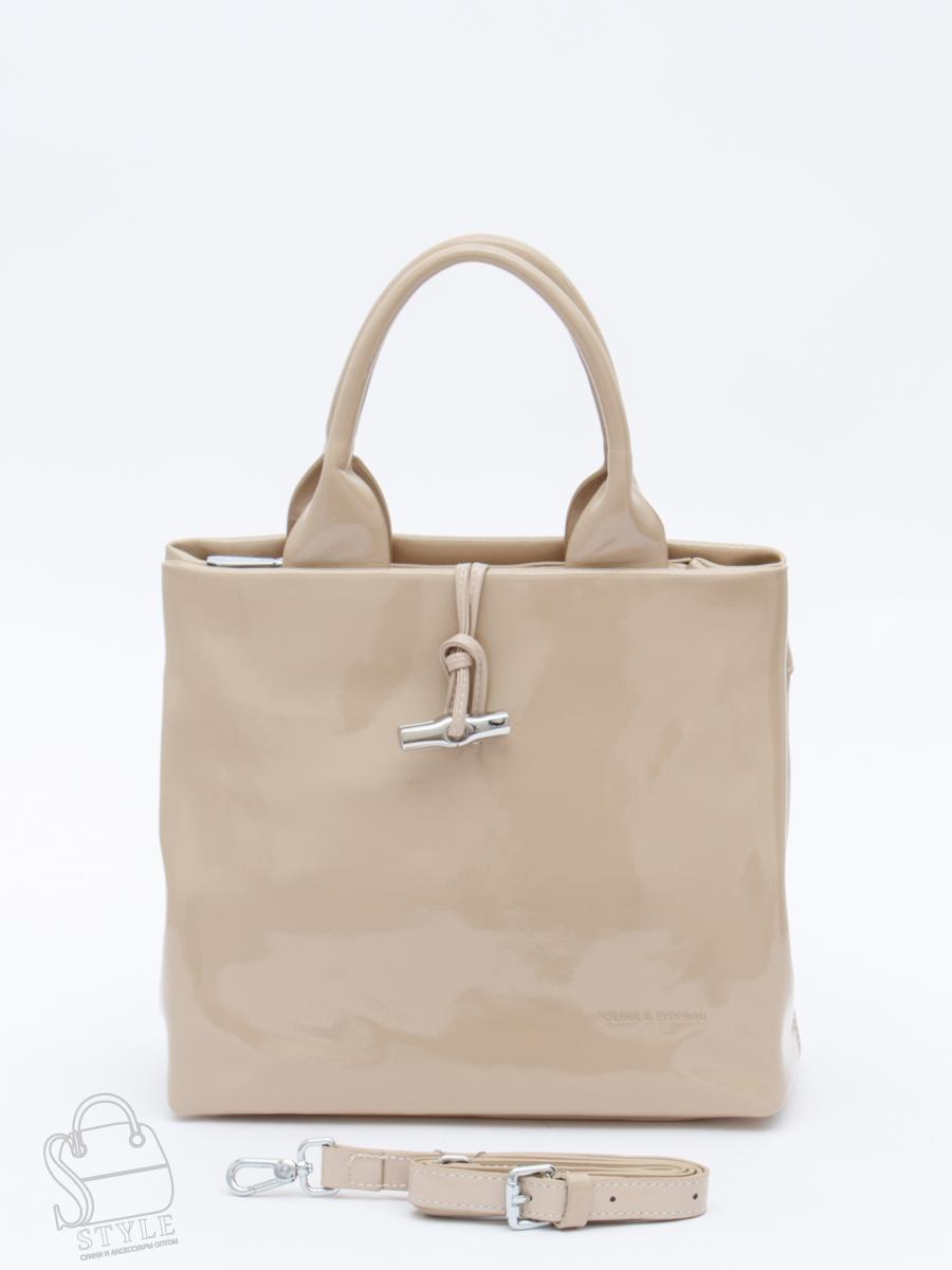 Элегантная модель, выполнена из натуральной лаковой кожи. Дополнена серебристой фурнитурой. Декорирована элементом на корпусе. Данная модель закрывается на молнию. Носится в руке за встроенные  ручки. Или на плече за съемный ремнь с регулировкой длины. Каркас полужесткий. На дне предусмотрены ножки.