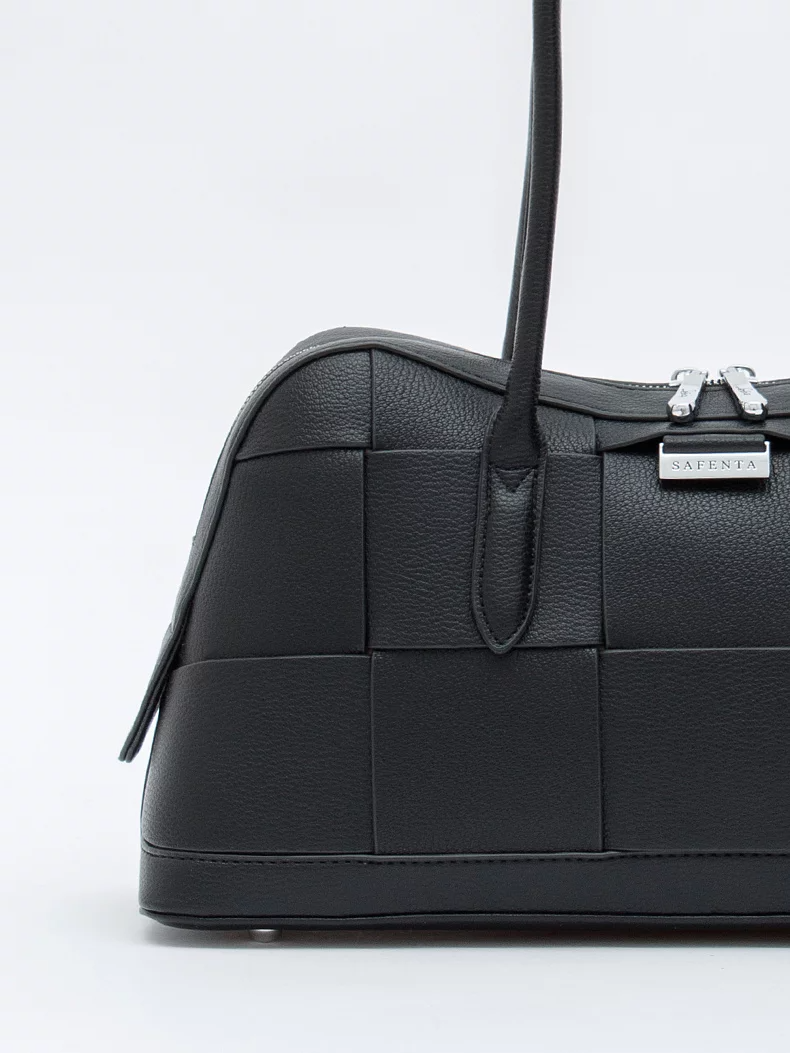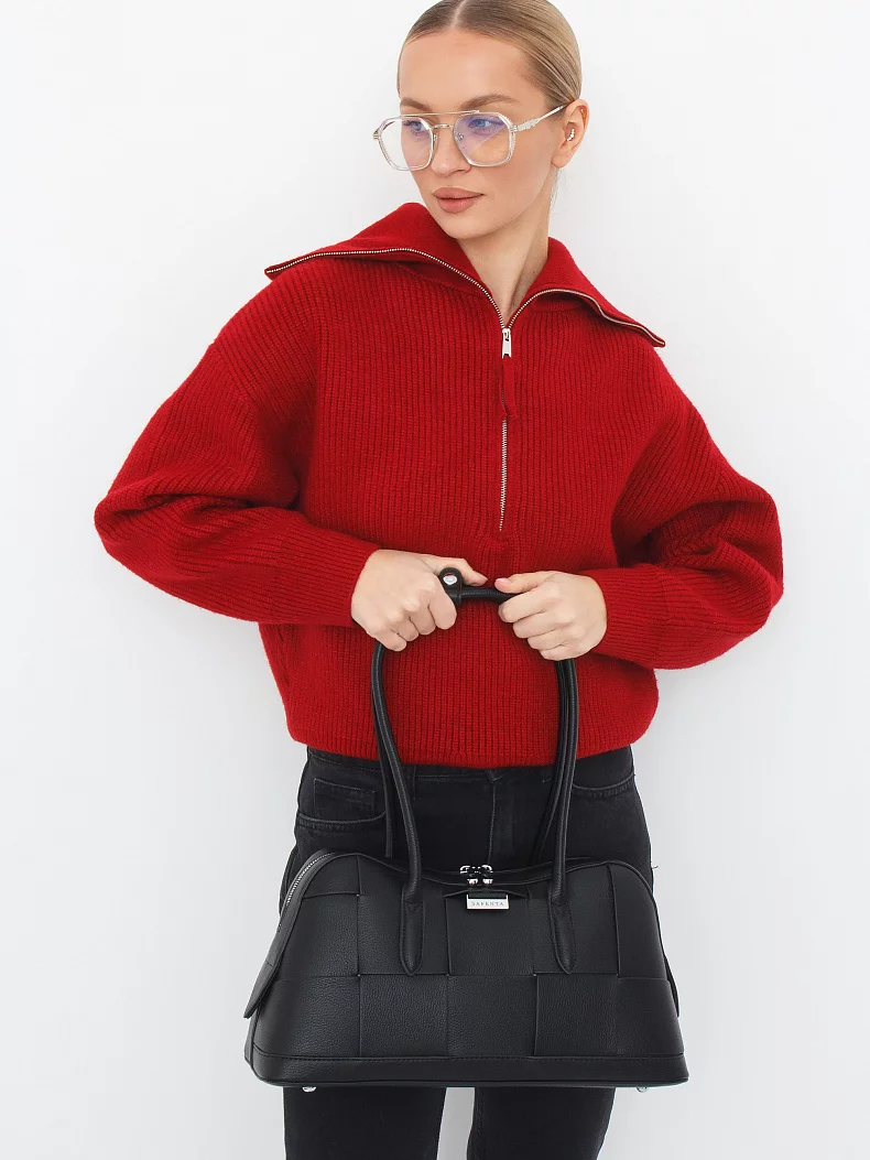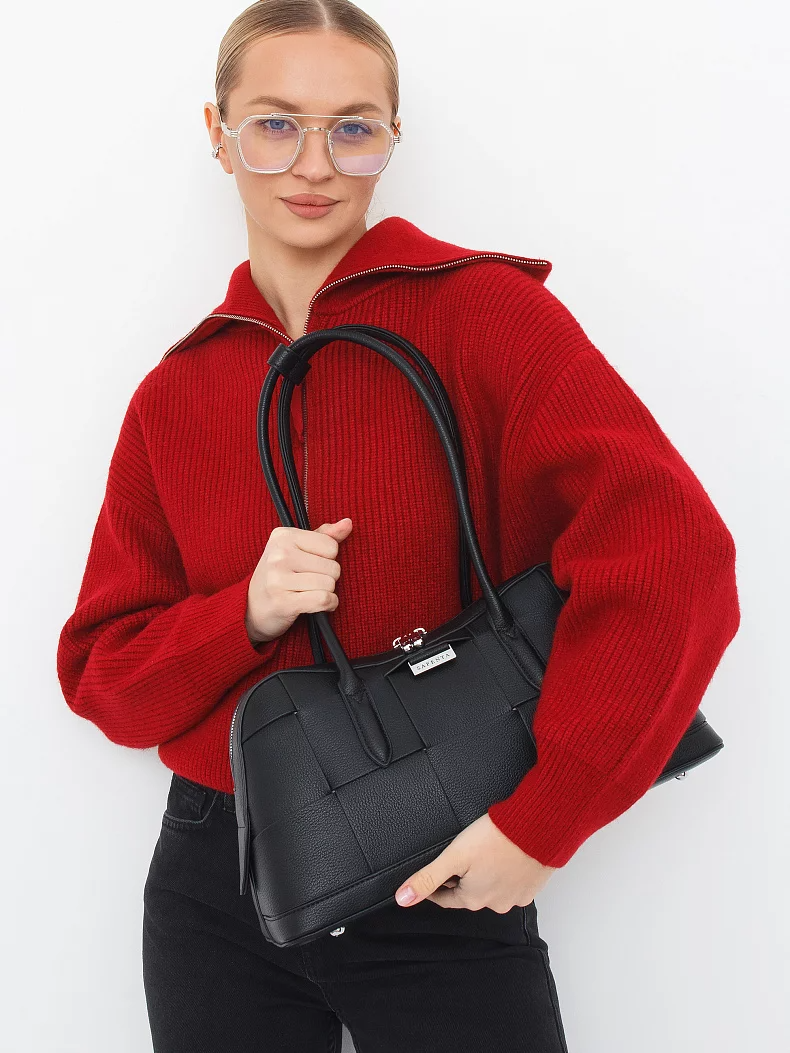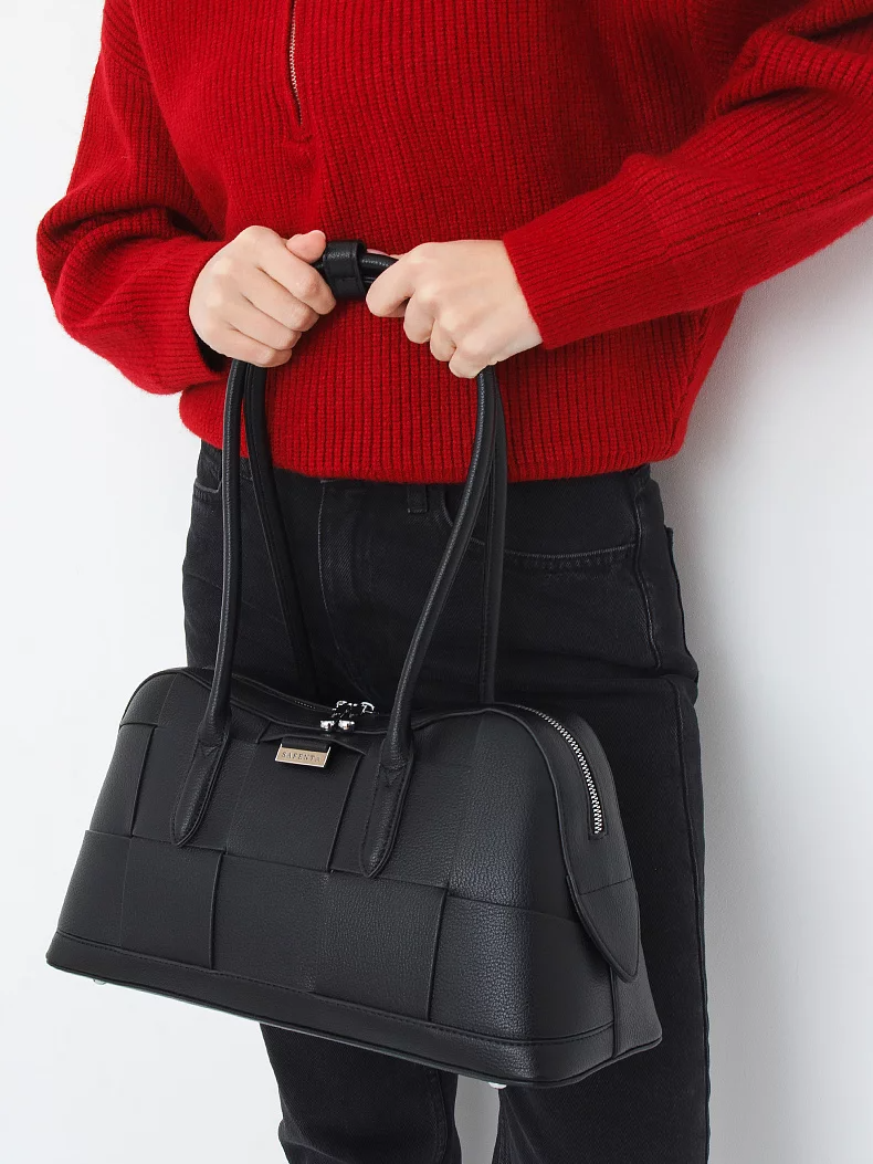 Сумка-плетенка, выполнена из экокожи. Дополнена серебристой фурнитурой. Данная модель закрывается на молнию, носится в руке за встроенные ручки с фиксацией. Каркас полужесткий.