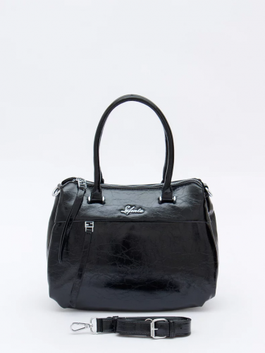 Сумка-портфель, выполнен из экокожи. Декорирована логотипом на передней части. Дополнена серебристой фурнитурой. Данная модель закрывается на молнию. Каркас полужесткий.  Носится в руке за встроенные ручки или на плече за ремень. В комплекте имеется съемный ремень с регулировкой длины.