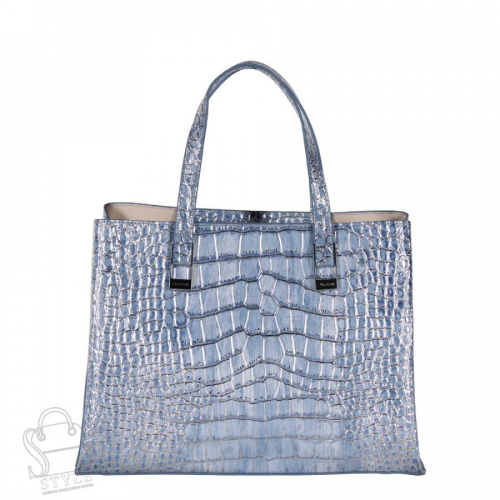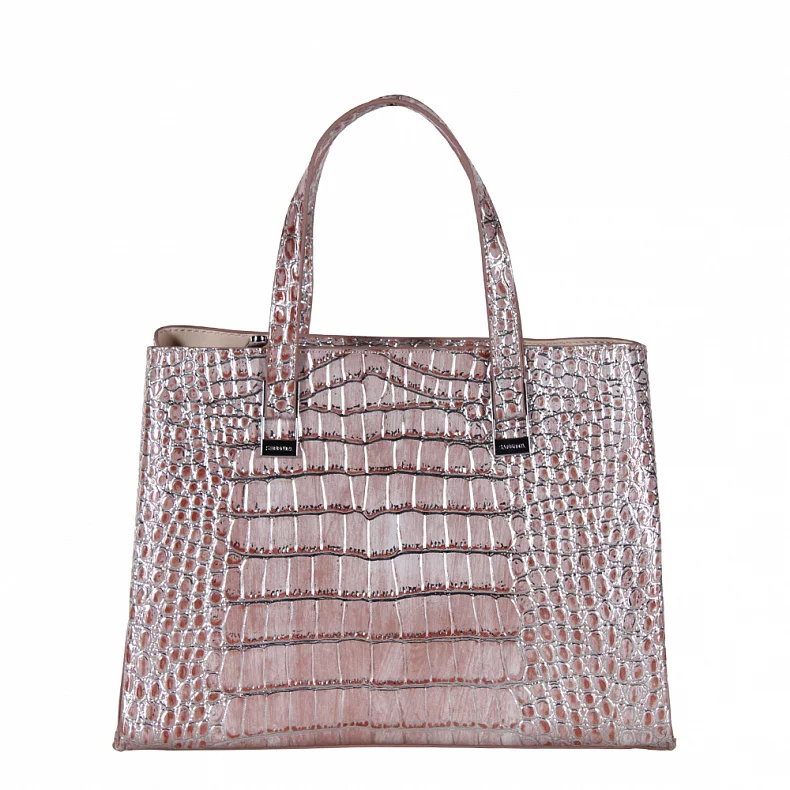 Сумка-тоут, выполнена из экокожи.  Декорирована перламутровым нанесением. Дополнена серебристой фурнитурой. Данная модель закрывается на молнию. Каркас жесткий. Носится в руке за короткую ручку или на плече. В комплекте имеется съемный ремень.