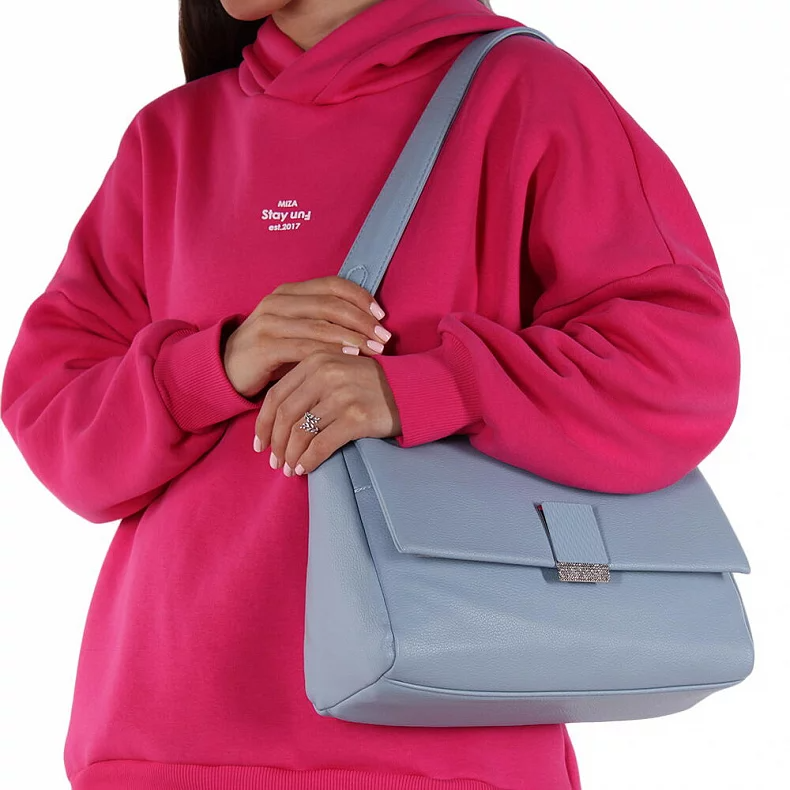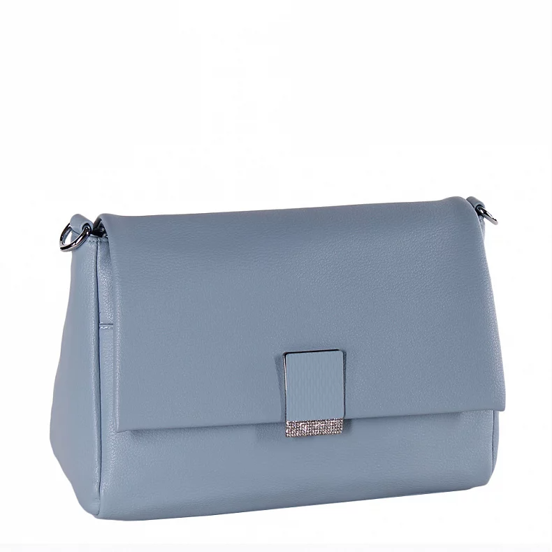 Удобная модель на каждый день, выполнена из экокожи. Дополнена серебристой фурнитурой. Данная модель закрывается на клапан. Каркас полужесткий. Сумка носится за ручку или за плечевой ремень на плече.