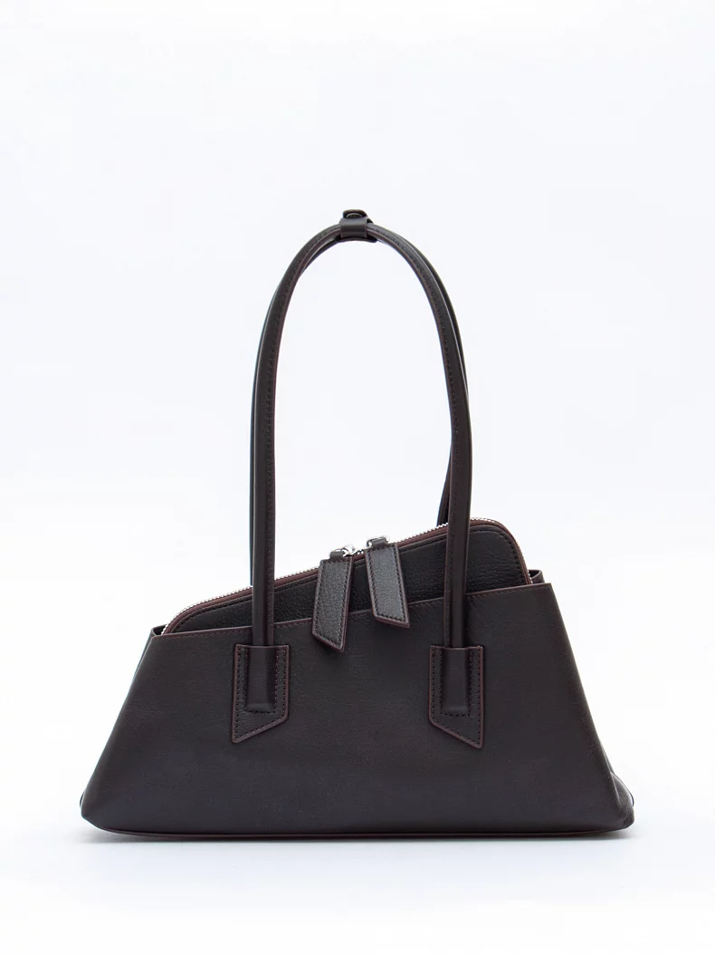Эффектная сумка ассиметричной формы, выполнена из кожи. Дополнена серебристой фурнитурой. Данная модель закрывается на молнию, носится в руке или на плече за встроенные ручки. На ручках имеется фиксатор. Каркас полужесткий.