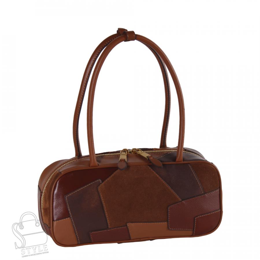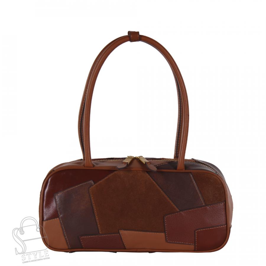 Интересная сумка, выполнена из натуральной кожи. Декорирована кусочка кожи. Дополнена золотистой фурнитурой. Данная модель закрывается на молнию, носится в руке за ручки. Каркас полужесткий.