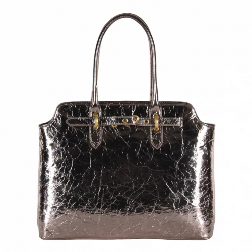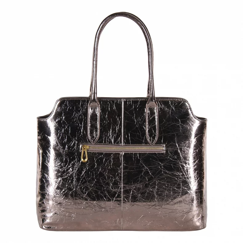 Вместительная модель выполнена из натуральной лаковой кожи. Дополнена золотистой фурнитурой. Данная модель закрывается на молнию, носится в руке. Каркас жесткий.