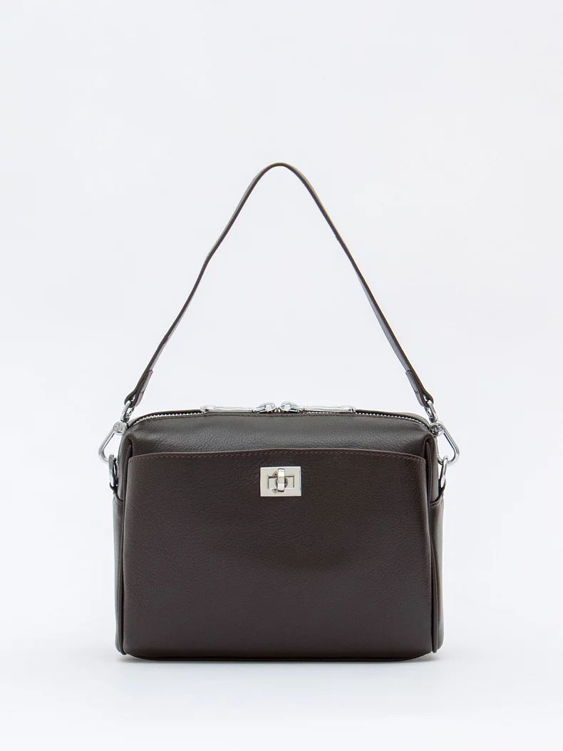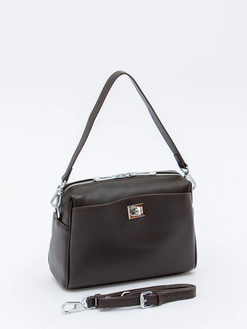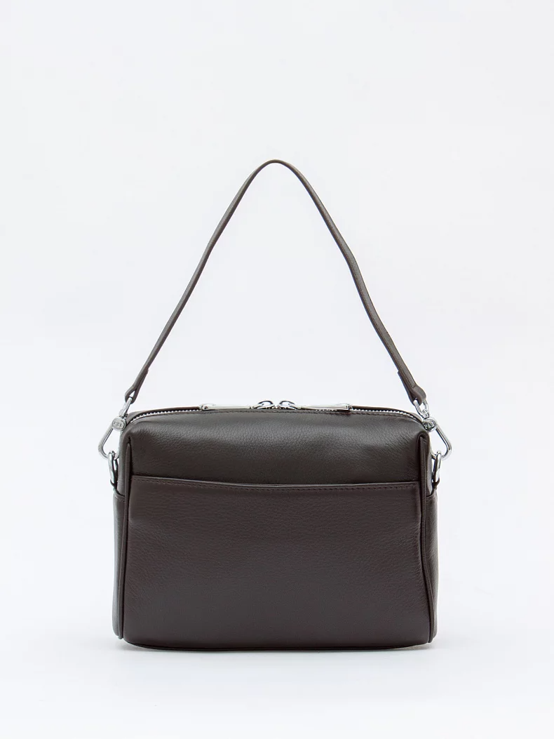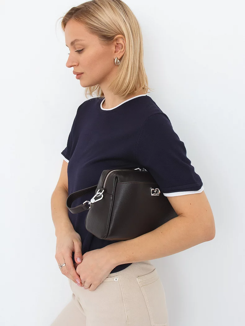 Лаконичная модель, выполнена из кожи. Дополнена серебристой фурнитурой. Данная модель закрывается на молнию. Каркас полужесткий. Носится в руке за съемную ручку или на плече. В комплекте имеется съемный ремень с регулировкой длины.