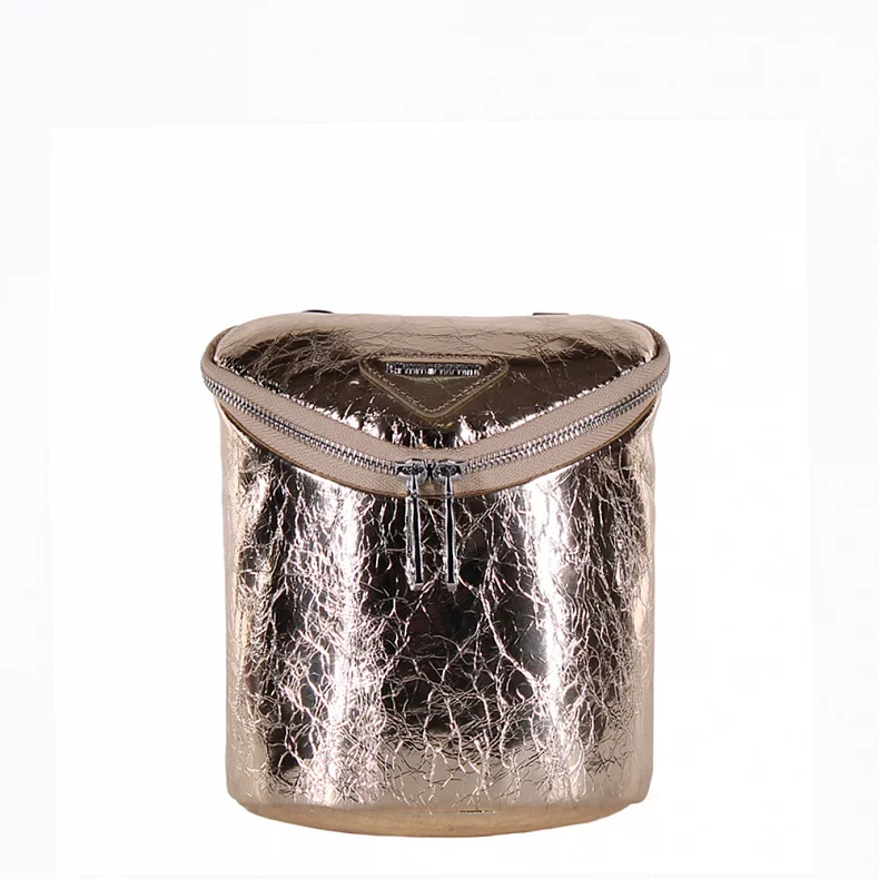 Эффектная металлизированная сумка интересной формы, выполнена из натуральной кожи. Декорирована логотипом бренда на передней части. Дополнена серебристой фурнитурой. Данная модель закрывается на молнию. Каркас полужесткий. Носится через плечо. В комплекте есть ремень-стропа и ключница.