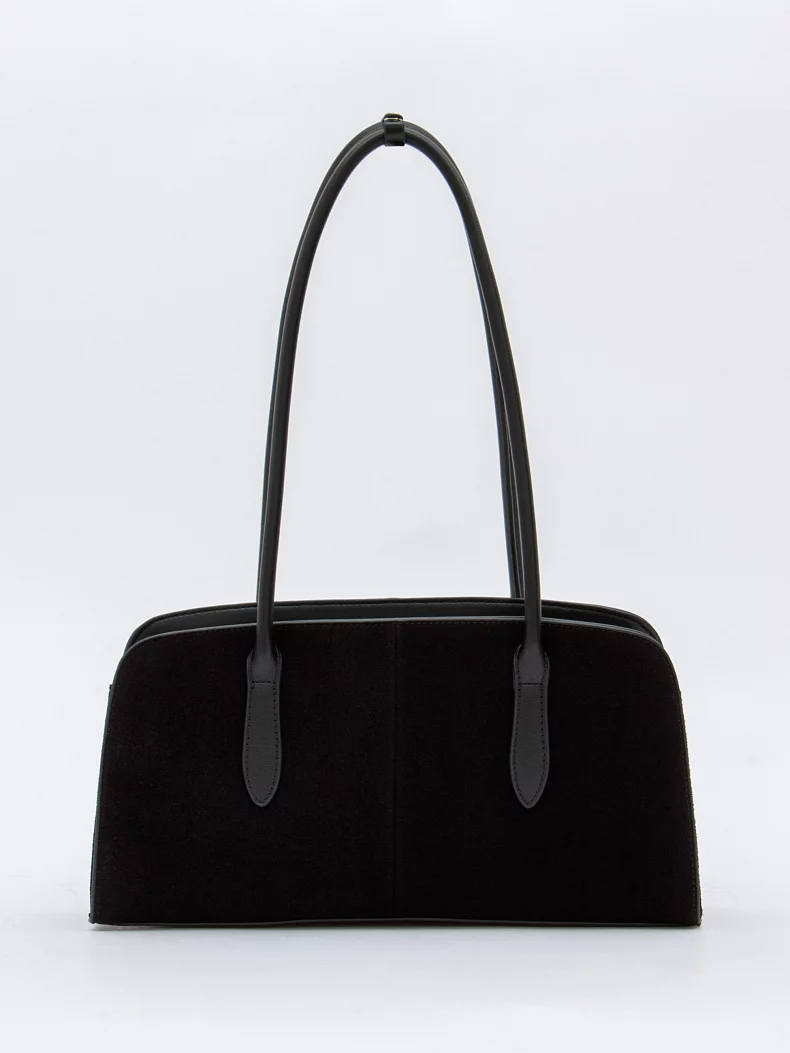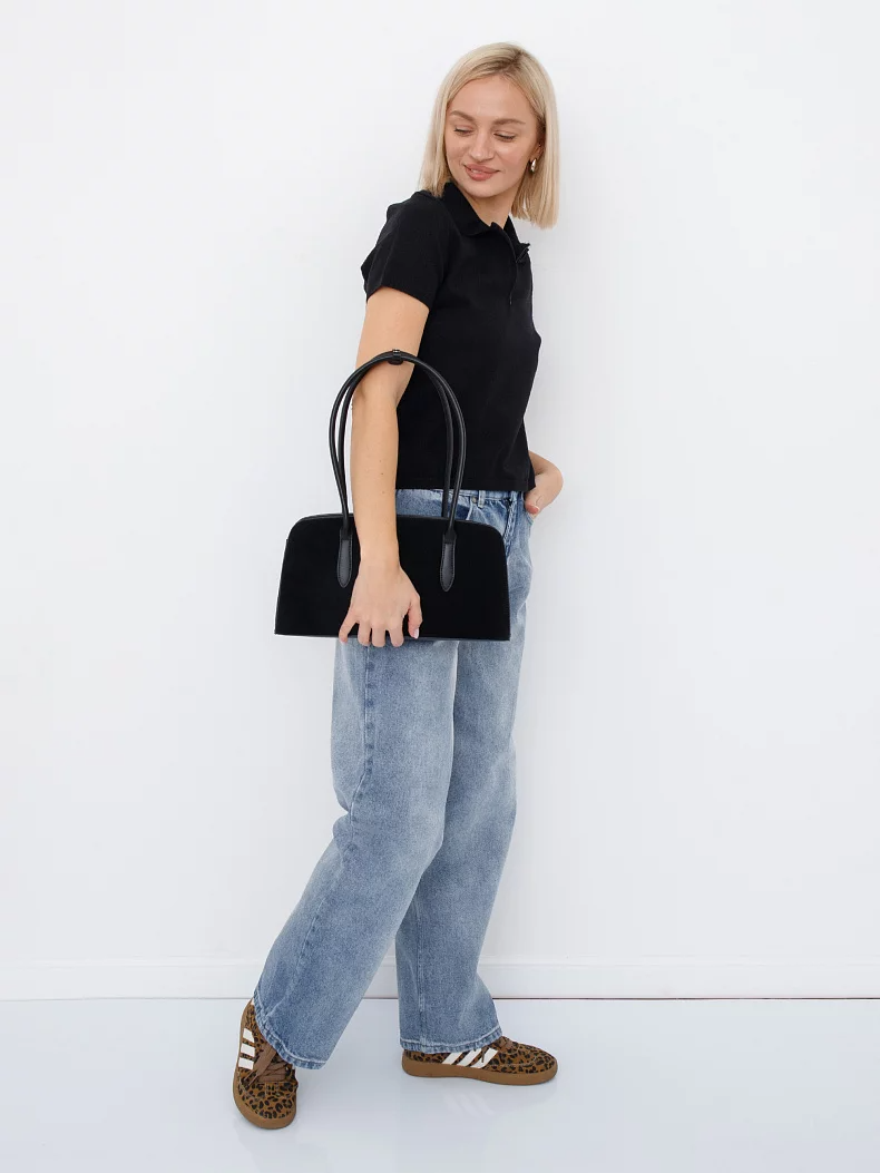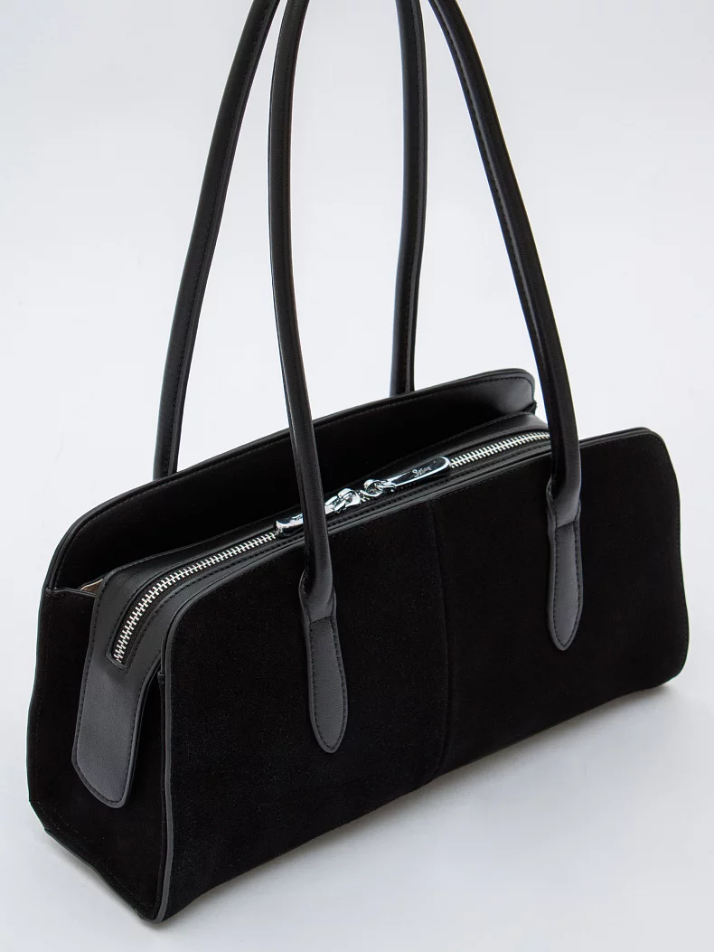Базовая сумка на каждый день выполнена из натуральной замши. Дополнена серебристой фурнитурой. Основной отдел закрывается на молнию. Сумка носится на плече за удлинённые ручки или через плечо. Каркас полужёсткий.