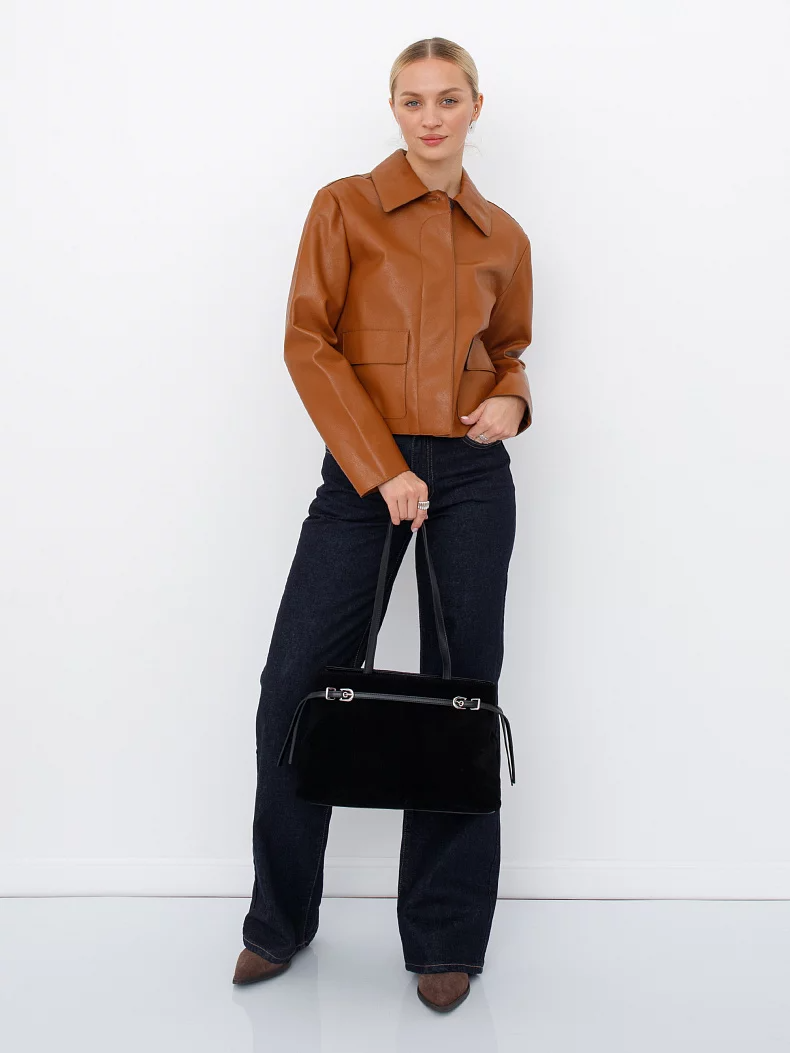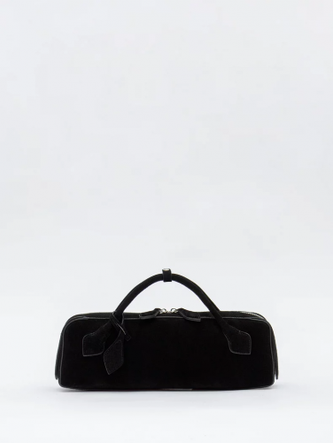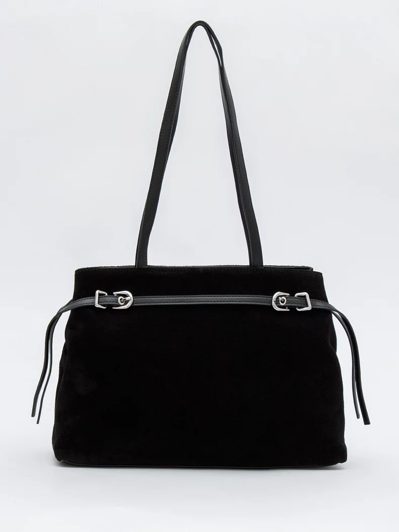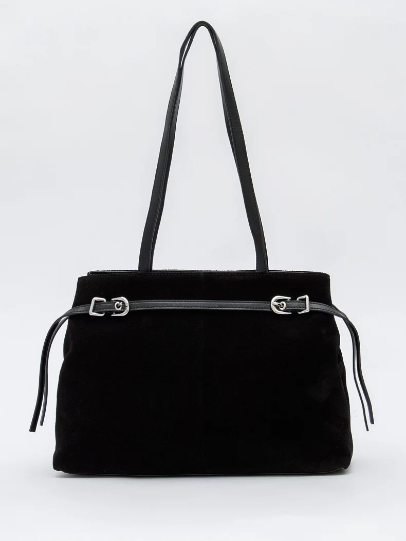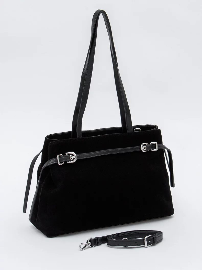 Базовая сумка, выполнена из замши. Декорирована ремнями на корпусе. Дополнена серебристой фурнитурой. Данная модель закрывается на молнию, носится в руке за встроенные удлиненные ручки или на плече. В комплекте имеется ремень с регулировки длины. Каркас полужесткий.