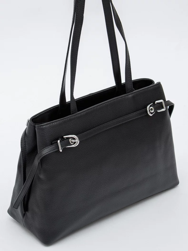 Базовая сумка, выполнена из натуральной кожи. Декорирована ремнями на корпусе. Дополнена серебристой фурнитурой. Данная модель закрывается на молнию, носится в руке за встроенные удлиненные ручки или на плече. В комплекте имеется ремень с регулировки длины. Каркас полужесткий.