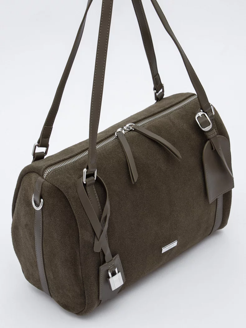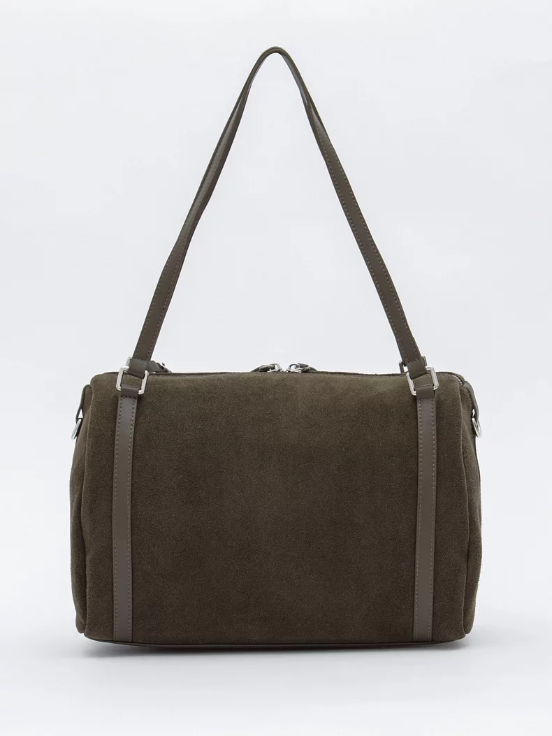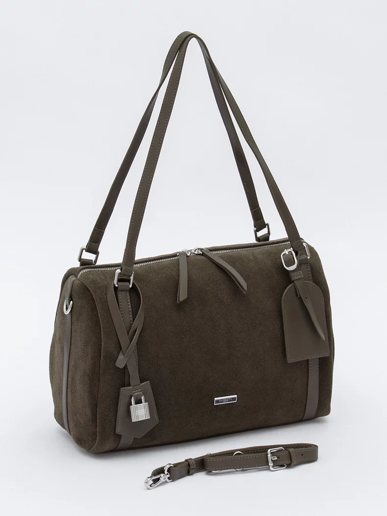 Базовая сумка, выполнена из замши. Декорирована брелоком. Дополнена серебристой фурнитурой. Данная модель закрывается на молнию. Каркас мягкий. Носится в руке за встроенные ручки, или на плече. В комплекте имеется съемный ремень с регулировкой длины.
