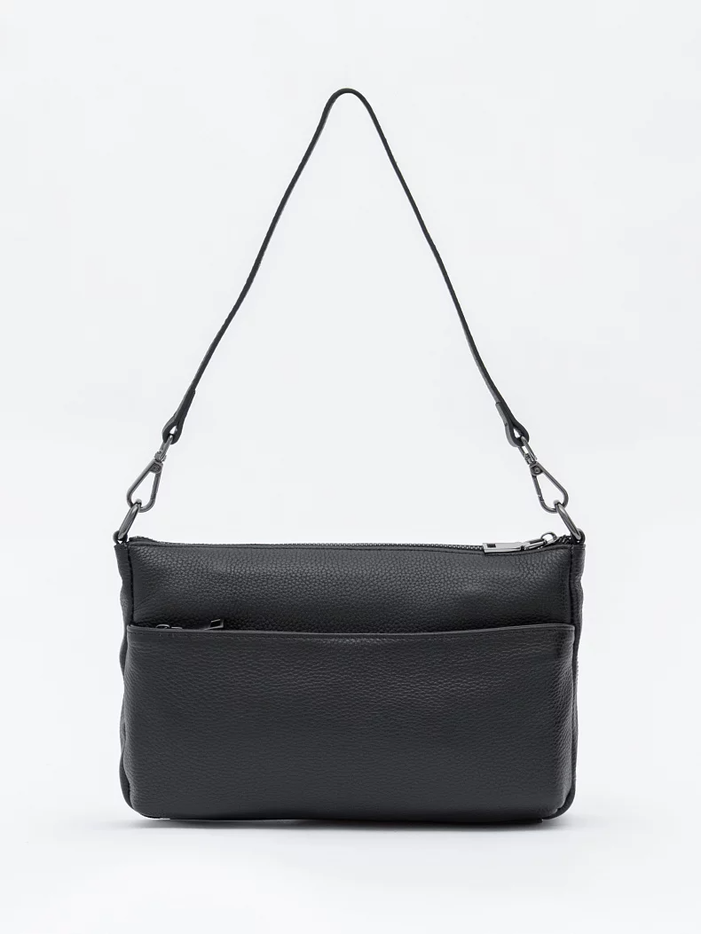 Базовая модель, выполнена из натуральной кожи. Дополнена серебристой фурнитурой. Данная модель закрывается на молнию. Носится в руке или на плече. В комплекте имеется съемная удлиненная ручка и плечевой ремень с регулировкой длины. Каркас полужесткий.
