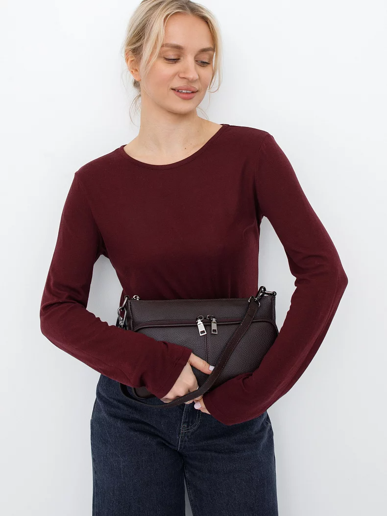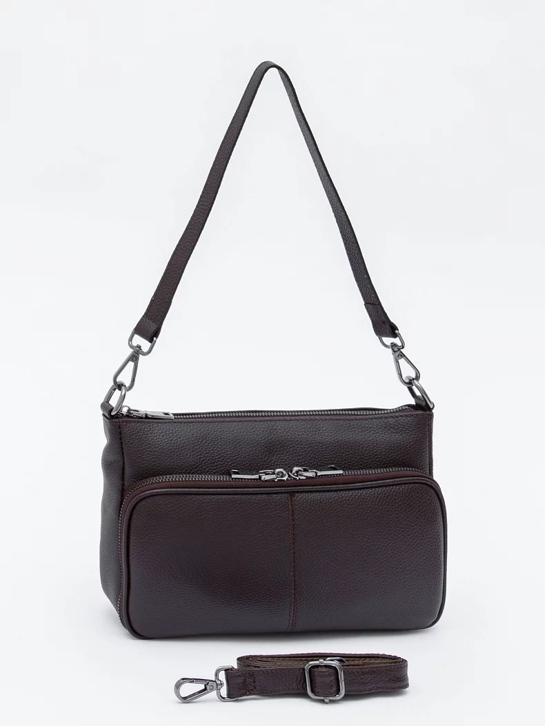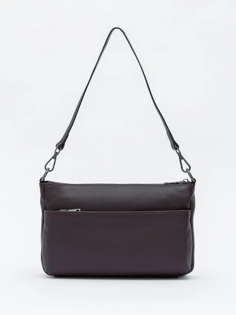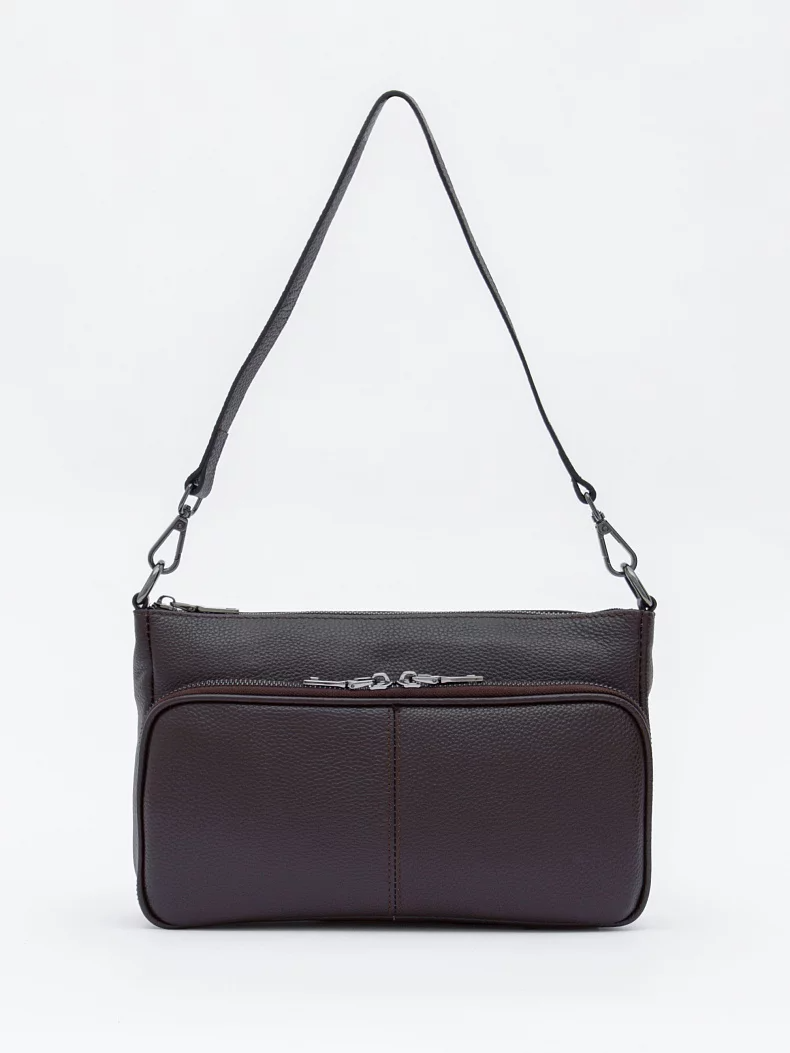Базовая модель, выполнена из натуральной кожи. Дополнена серебристой фурнитурой. Данная модель закрывается на молнию. Носится в руке или на плече. В комплекте имеется съемная удлиненная ручка и плечевой ремень с регулировкой длины. Каркас полужесткий.