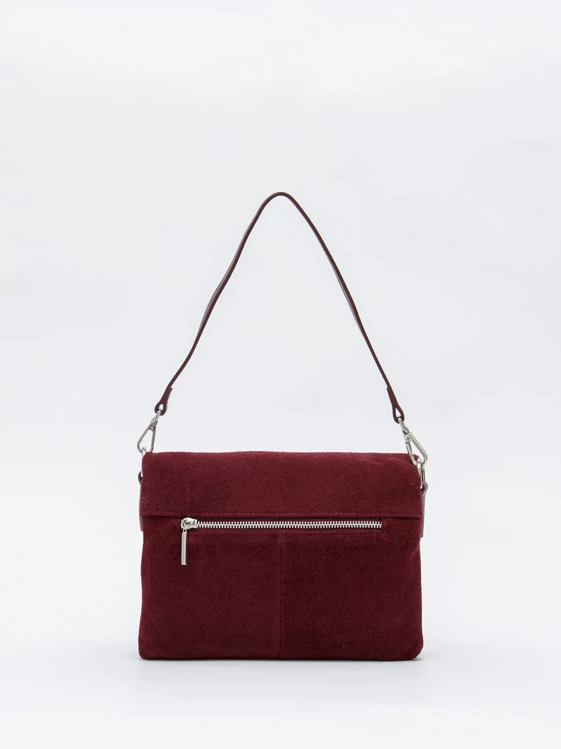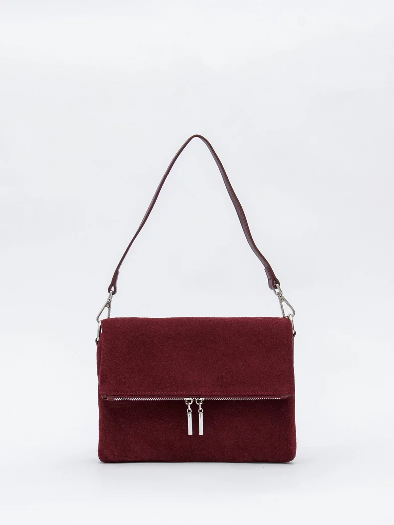 Модель кросс-боди, выполнена из замши. Дополнена серебристой фурнитурой. Данная модель закрывается на клапан. Каркас полужесткий. Носится в руке за съемную удлиненную ручку или на плече. В комплекте имеется съемный ремень с регулировкой длины.