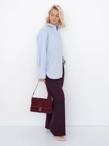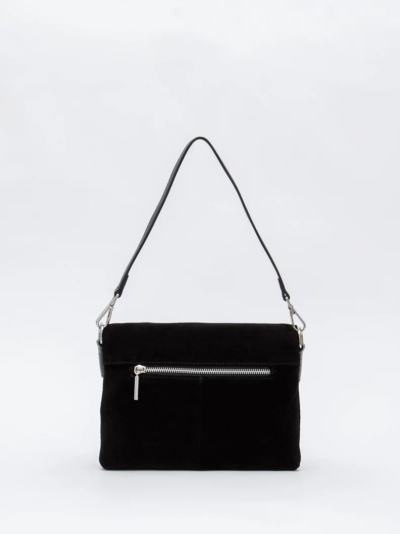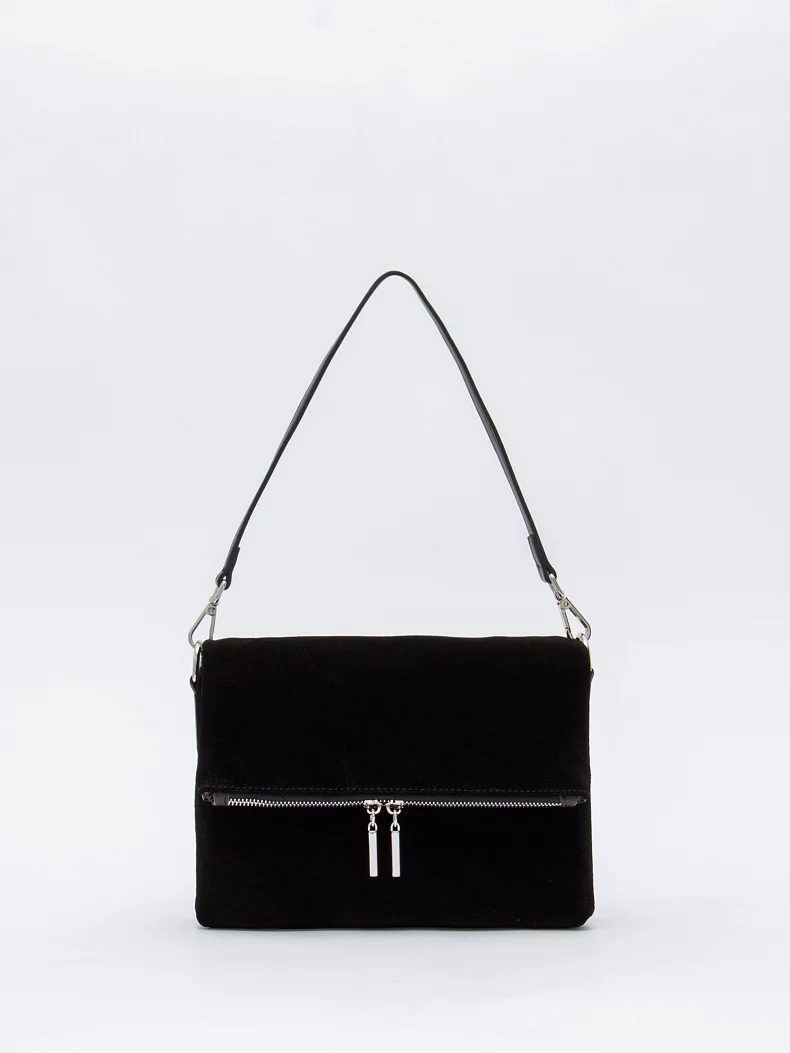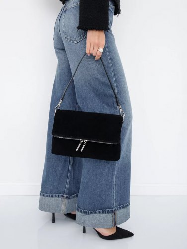 Модель кросс-боди, выполнена из замши. Дополнена серебристой фурнитурой. Данная модель закрывается на клапан. Каркас полужесткий. Носится в руке за съемную удлиненную ручку или на плече. В комплекте имеется съемный ремень с регулировкой длины.