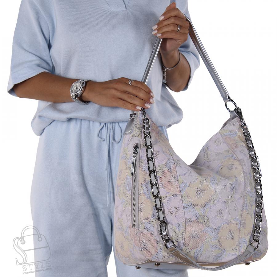 Вместительная модель, выполнена из замши лазерной обработки. Декорирована цепочкой. Дополнена серебристой фурнитурой. Данная модель закрывается на молнию. Каркас мягкий. Носится на плече или в руке за удлиненную встроенную ручку. На дне предусмотрены ножки.