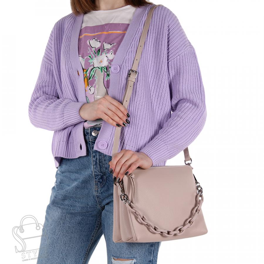 Базовая модель кросс-боди, выполнена из натуральной кожи. Декорирована матовой цепочкой. Дополнена серебристой фурнитурой. Данная модель закрывается на молнию, носится в руке или на плече. В комплекте имеется съемный ремень с регулировкой длины. Каркас полужесткий.