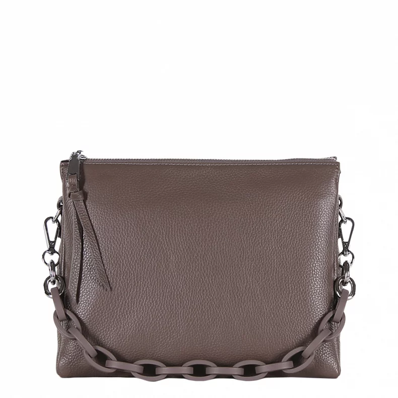 Базовая модель кросс-боди, выполнена из натуральной кожи. Декорирована матовой цепочкой. Дополнена серебристой фурнитурой. Данная модель закрывается на молнию, носится в руке или на плече. В комплекте имеется съемный ремень с регулировкой длины. Каркас полужесткий.