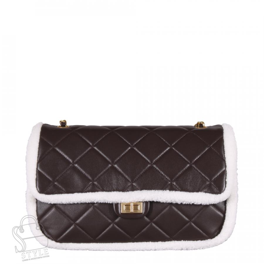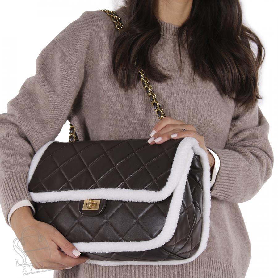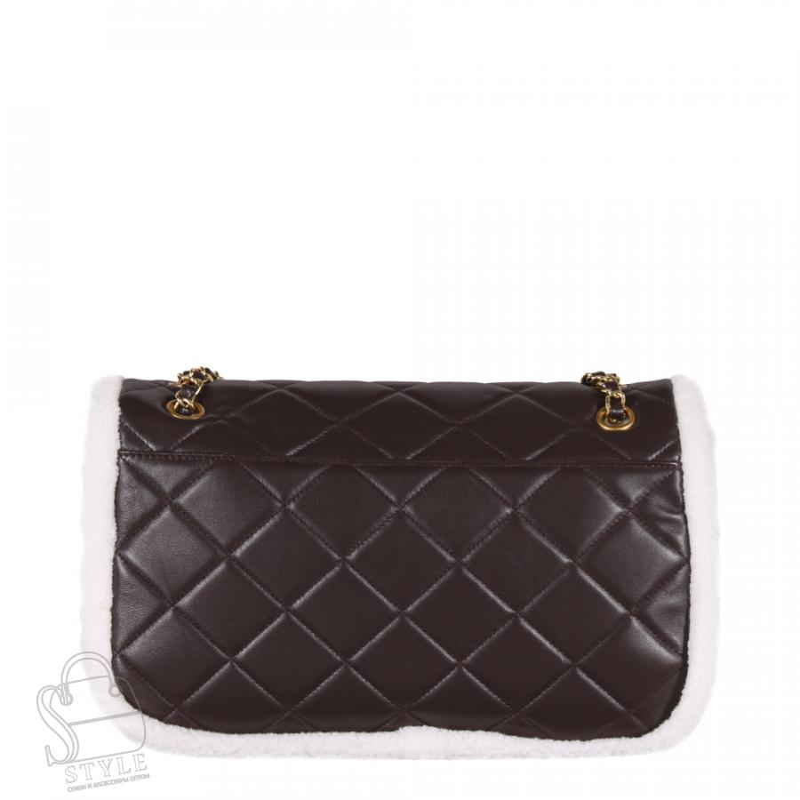 Сумка со стежкой, выполнена из натуральной кожи. Декорирована экомехом. Дополнена золотистой фурнитурой. Данная модель закрывается на клапан, носится в руке за ручки. Каркас полужесткий. Ручка-цепочка перетягивается.