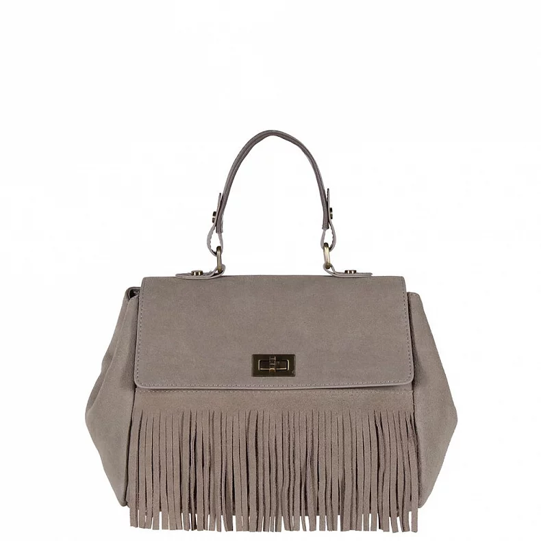 Эффектная модель, выполнена из замши. Декорирована бахромой.  Дополнена серебристой фурнитурой. Каркас полужесткий. Носится в руке за короткую ручку или на плече. В комплекте имеется съемный ремень с регулировкой длины.