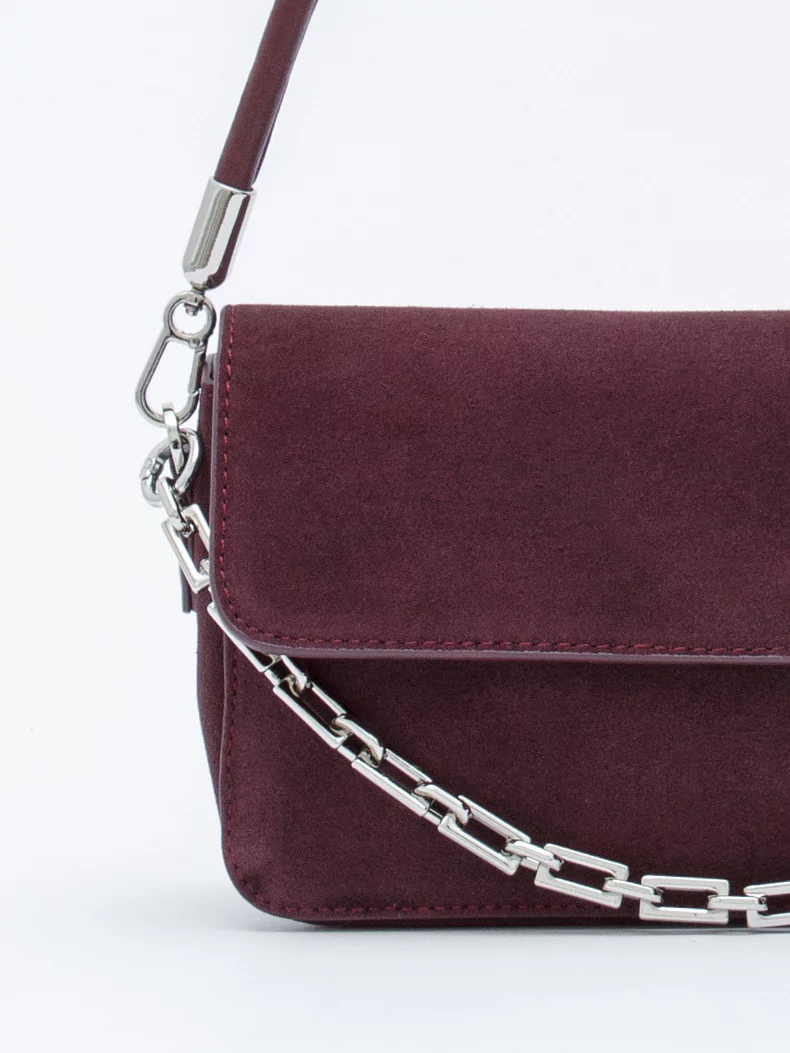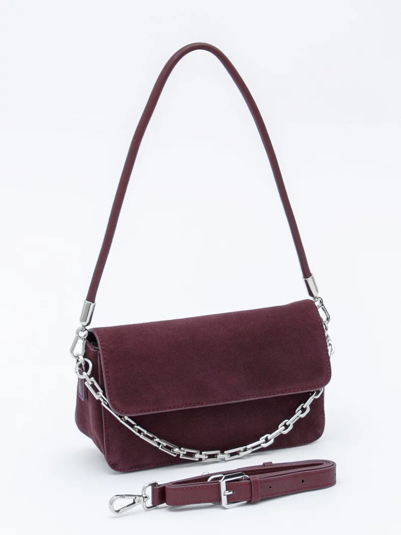 Сумка-багет, выполнена из замши. Декорирована цепочкой. Дополнена серебристой фурнитурой. Данная модель закрывается на клапан. Каркас полужесткий. Носится на плече за съемную ручку или через плечо. В комплекте имеется съемный ремень с регулировкой длины.