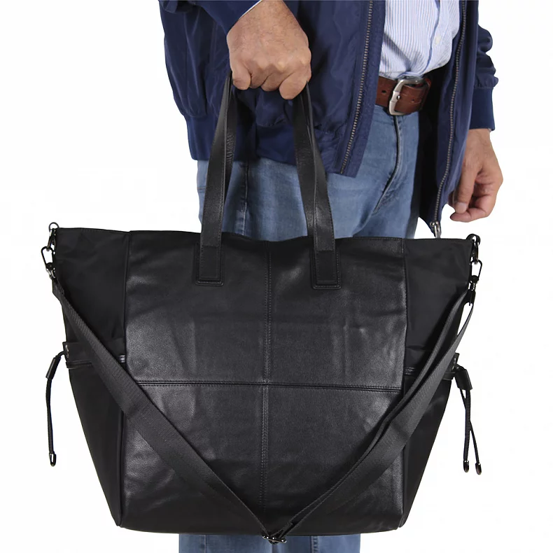 Дорожная сумка выполнена из натуральной кожи и текстиля. Дополнена серебристой фурнитурой. Данная модель закрывается на молнию, носится в руке или на плече с помощью ремня. В комплекте предусмотрен ремень-стропа с регулировкой длины. Каркас мягкий.