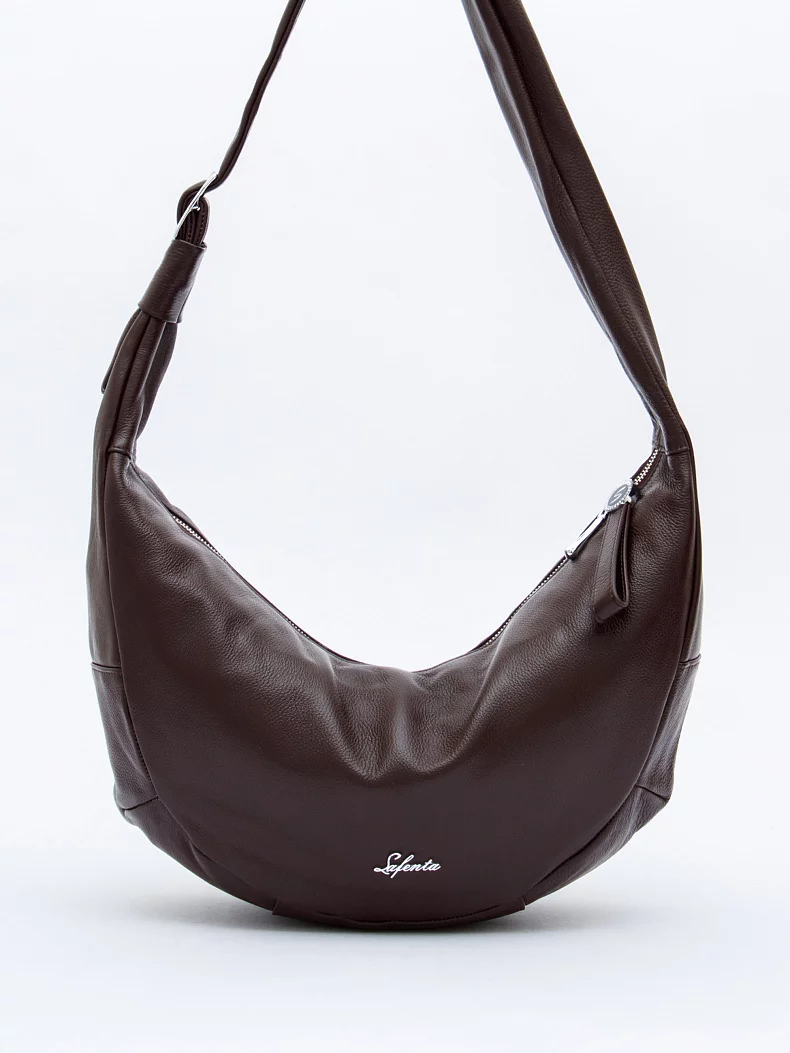 Сумка-хобо, выполнена из кожи. Декорирована логотипом на передней части. Дополнена серебристой фурнитурой. Данная модель закрывается на молнию, носится в руке или на плече за встроенный ремень, который регулируется по длине. Каркас мягкий.