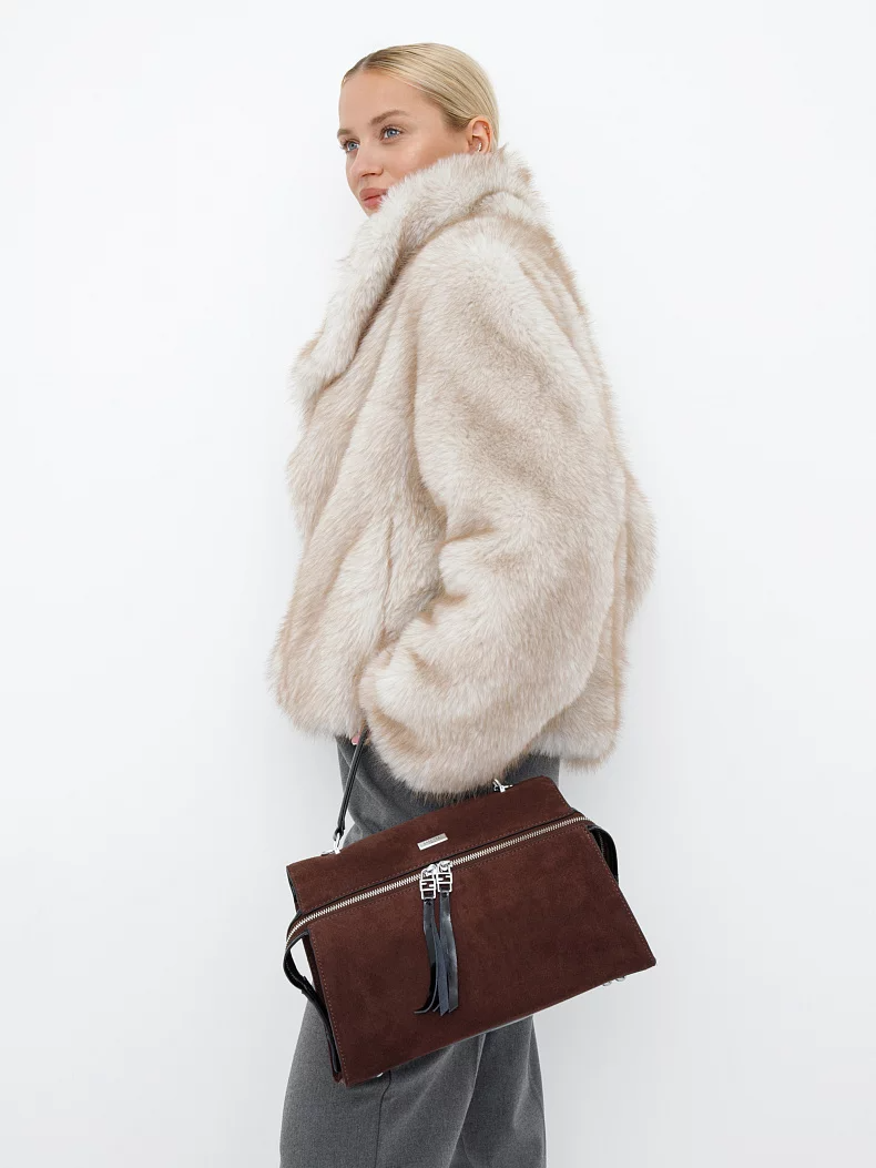 Стильная модель, выполнена из замши. Декорирована "собачками". Дополнена серебристой фурнитурой. Данная модель закрывается на удлинённую молнию, которая фиксируется по бокам сумки. Носится в руке за встроенную ручку. Или сумка носится на плече, в комплекте имеется съемный ремень с регулировкой длины. Каркас полужесткий. На дне предусмотрены ножки.