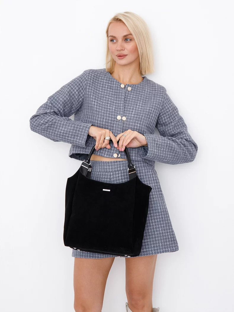 Вместительная сумка, выполнена из замши. Дополнена серебристой фурнитурой. Декорирована логотипом на передней части.  Данная модель закрывается на молнии. Носится в руке за встроенные ручки или на плече за съемный  ремень с регулировкой длины.  Каркас полужесткий.