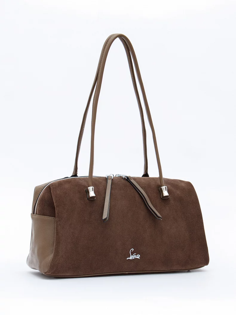 Модель-такса, выполнена из замши и натуральной кожи. Декорирована "собачками". Дополнена серебристой фурнитурой.  Данная модель закрывается на молнию. Носится  в руке или на плече за встроенные удлиненные ручки. Каркас полужесткий. На дне предусмотрены ножки.