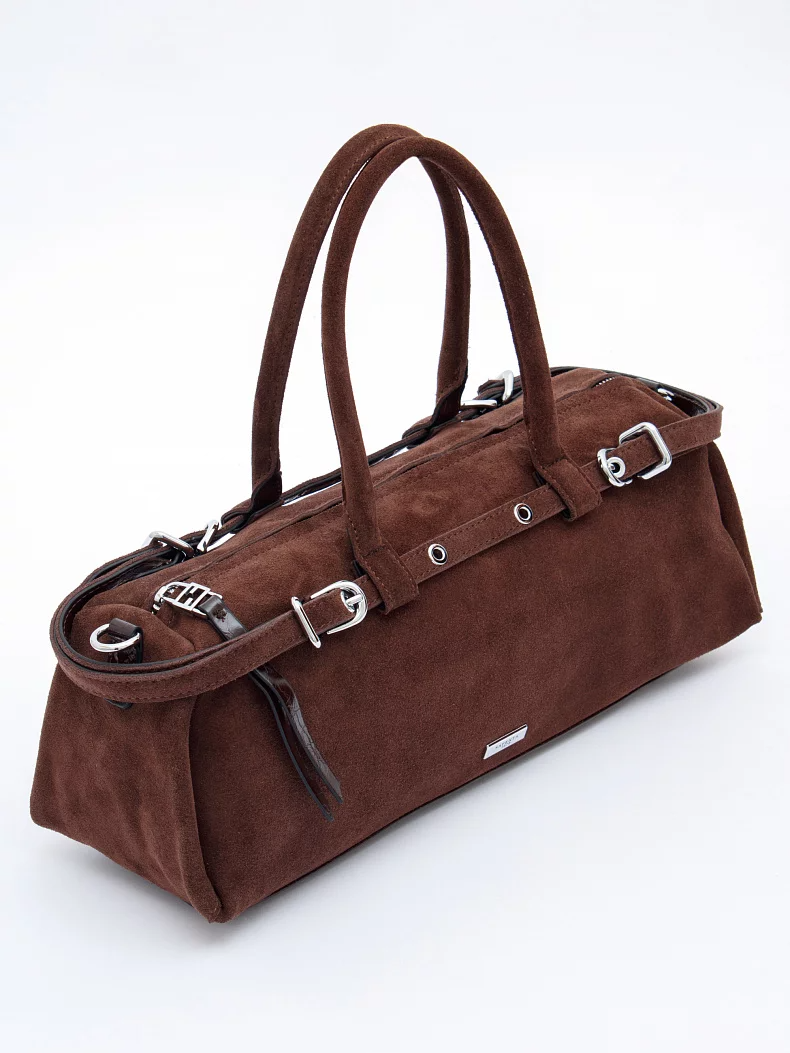 Сумка-багет,  выполнена из замши. Дополнена серебристой фурнитурой. Декорирована ремнем по корпусу. Данная модель закрывается на молнию, носится в руке за встроенные ручки или на плече. В комплекте имеется съемный ремень с регулировкой длины. Каркас полужесткий.