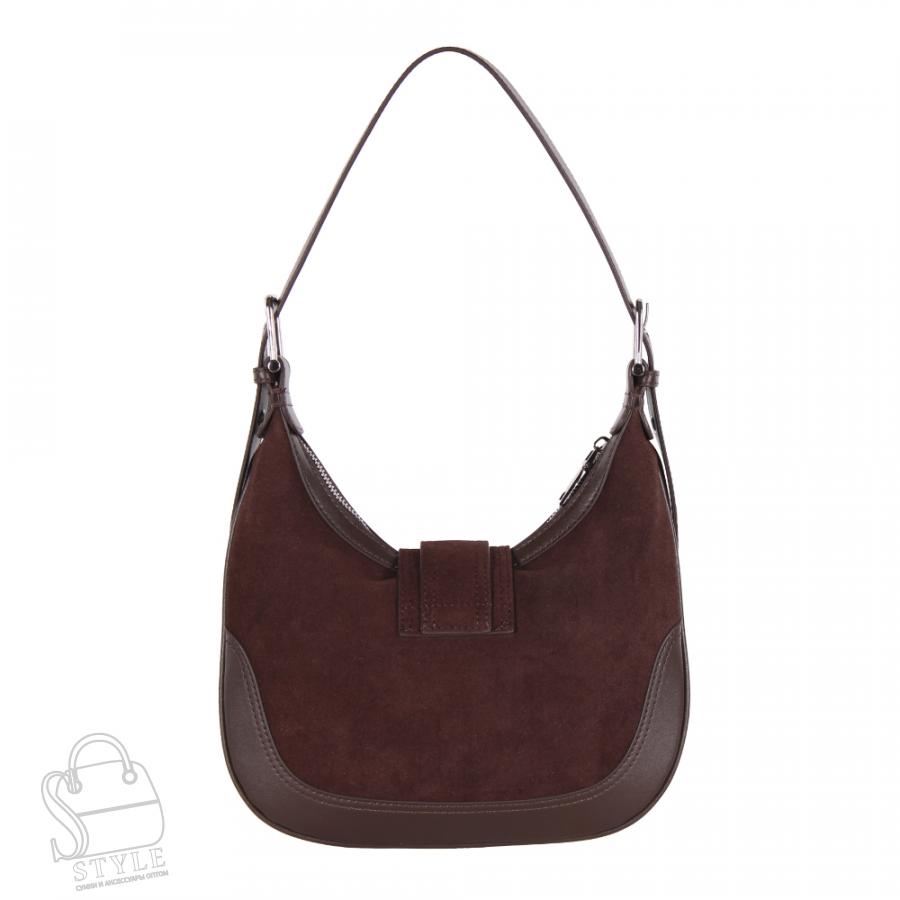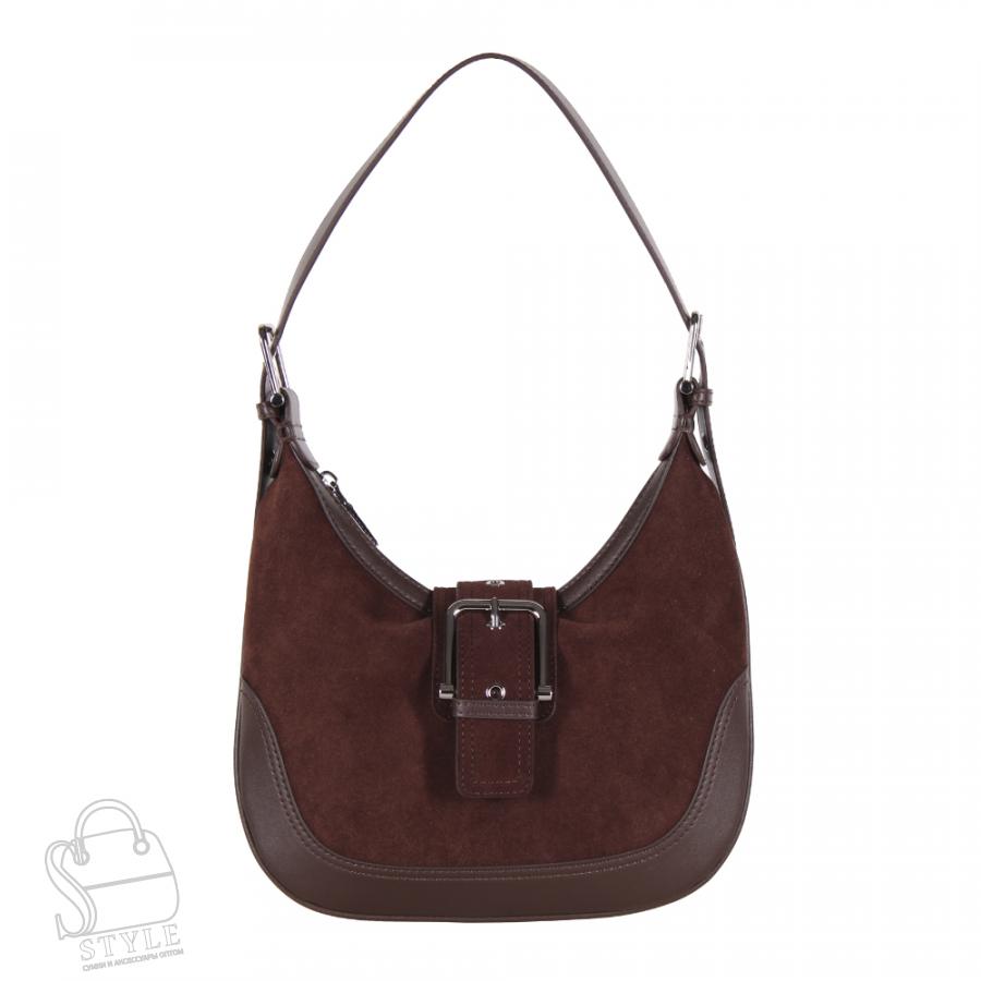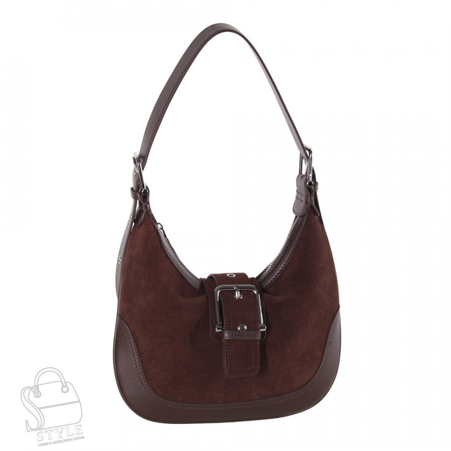 Модель в форме полумесяц, выполнена из натуральной кожи и замши. Декорирована пряжкой на передней части.  Дополнена серебристой фурнитурой. Данная модель закрывается на хлястик. Каркас полужесткий. Носится на плече или в руке, встроенная ручка регулируется по длине.