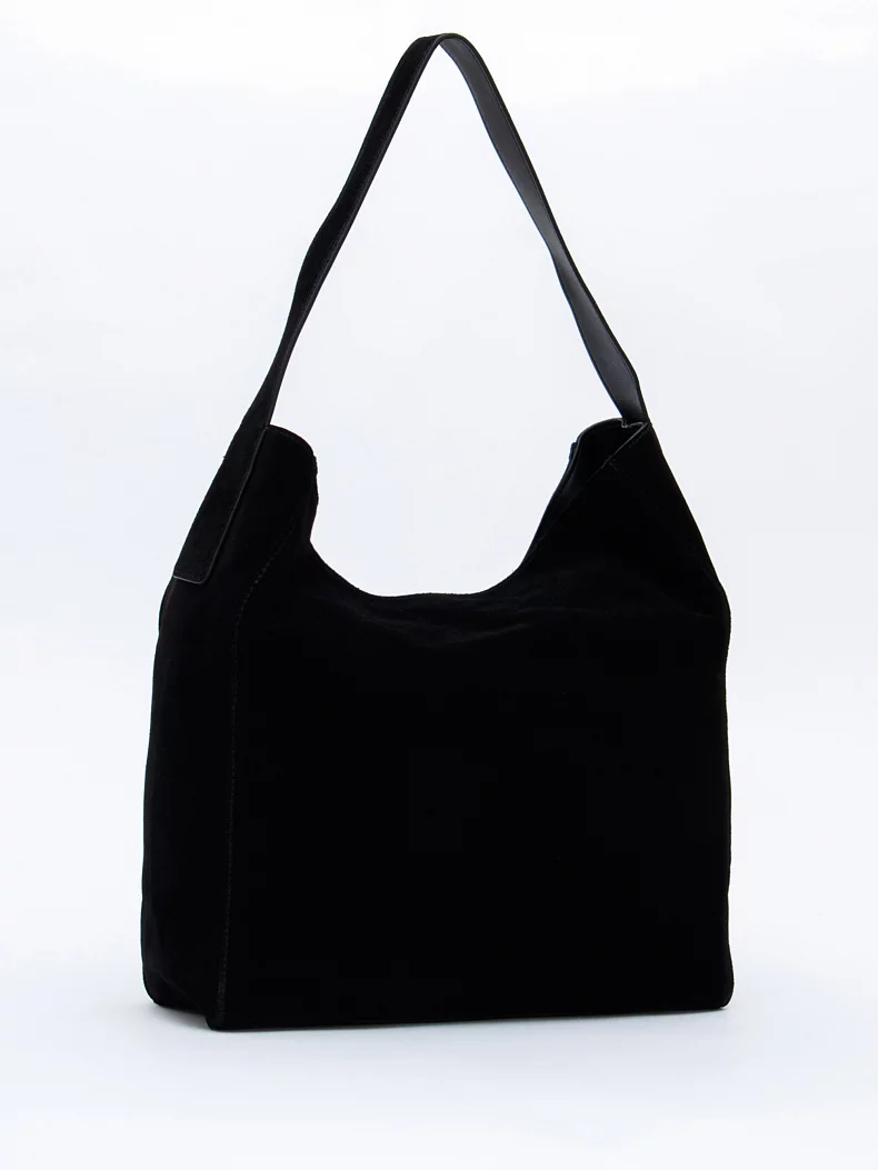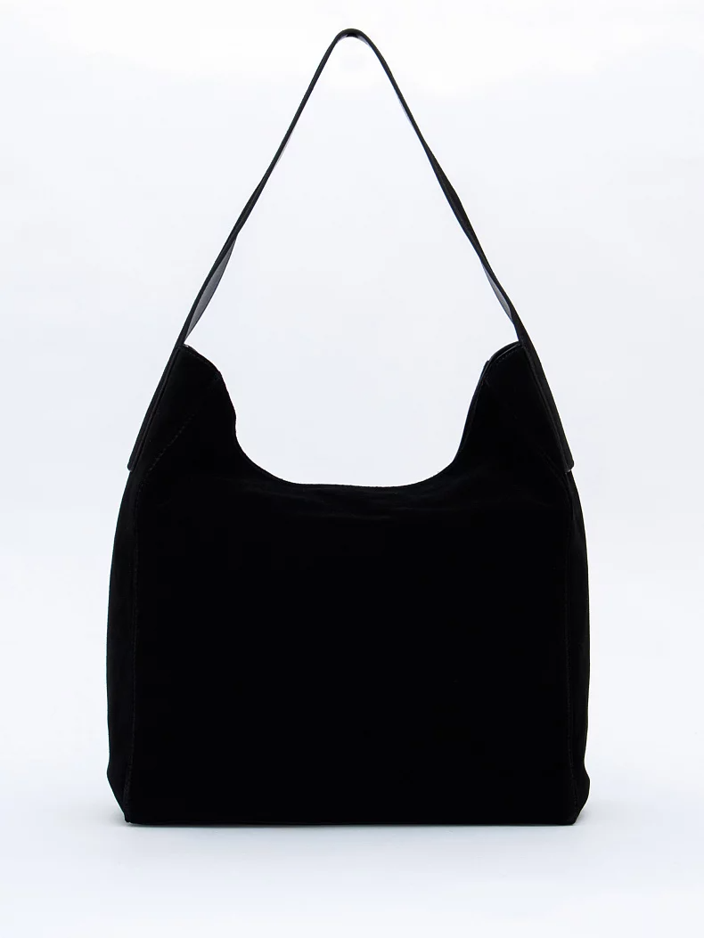 Вместительная сумка, выполнена из замши. Дополнена серебристой фурнитурой. Данная модель закрывается на кнопку. Носится в руке за встроенную ручку. Каркас мягкий.