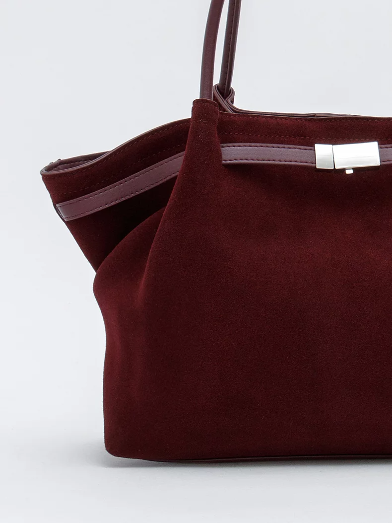 Стильная сумка, выполнена из натуральной замши. Декорирована ремнем на корпусе. Дополнена серебристой фурнитурой. Данная модель закрывается на кнопку. Носится в руке за встроенные удлиненные ручки или на плече. В комплекте имеется съемный ремень с регулировкой длины. Каркас мягкий.