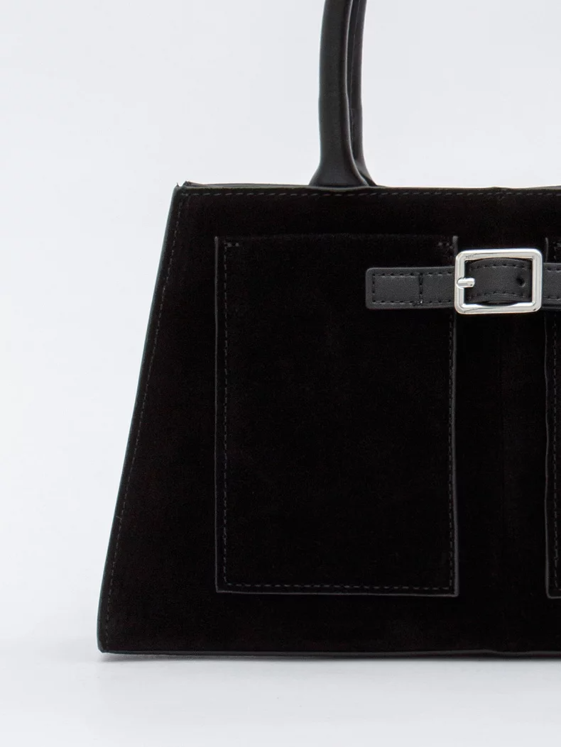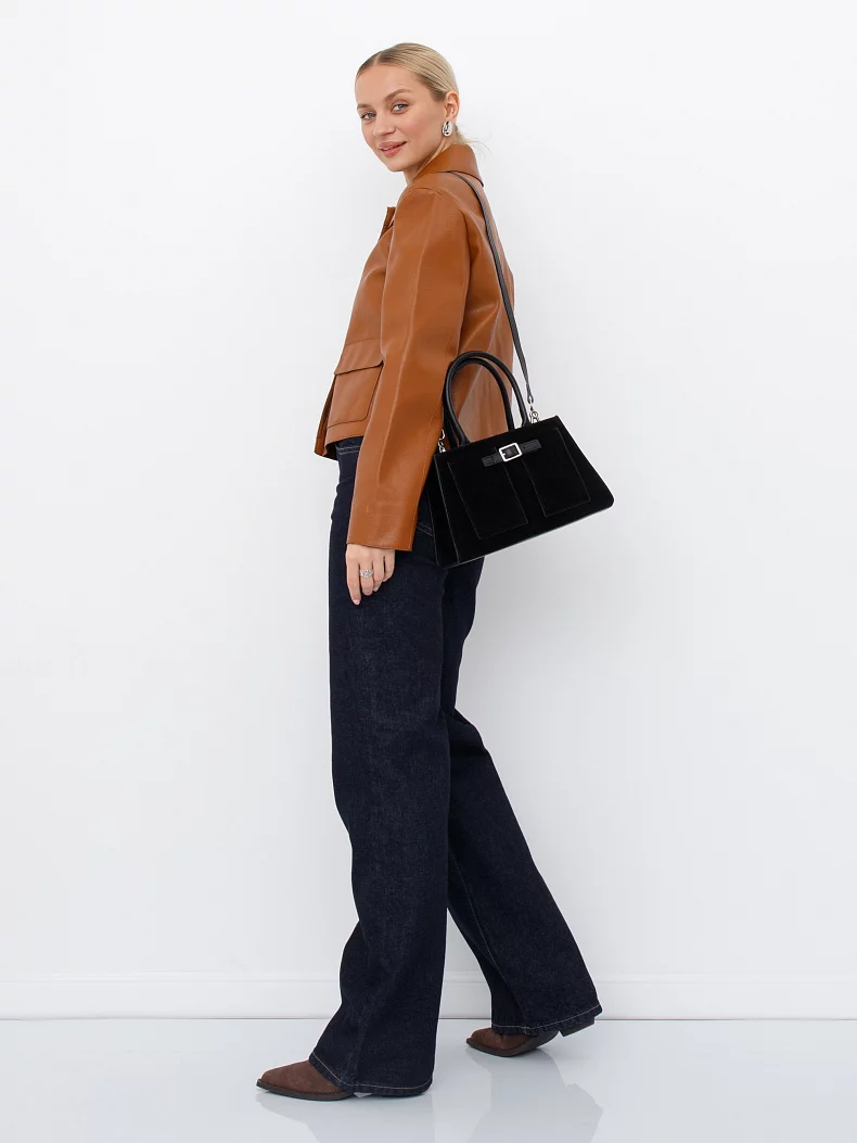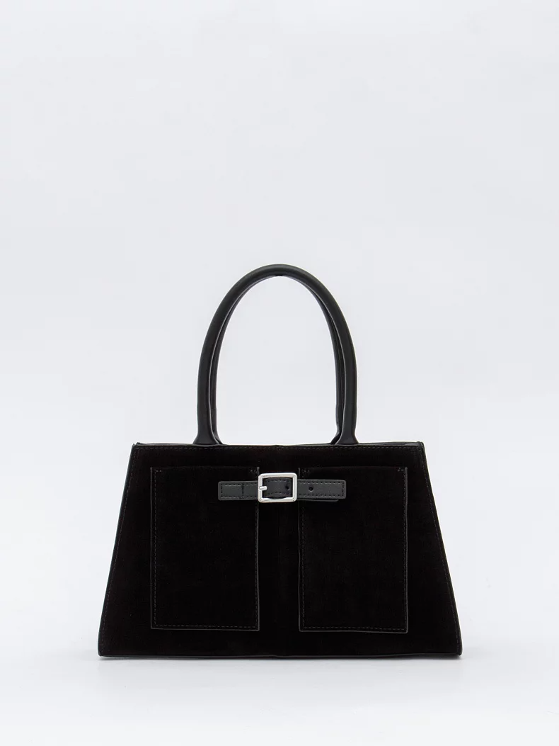 Компактная модель, выполнена из натуральной замши. Декорирована ремнем на корпусе. Дополнена серебристой фурнитурой. Данная модель закрывается на молнию. Носится в руке за встроенные ручки или на плече. В комплекте имеется съемный ремень с регулировкой длины. Каркас жесткий.