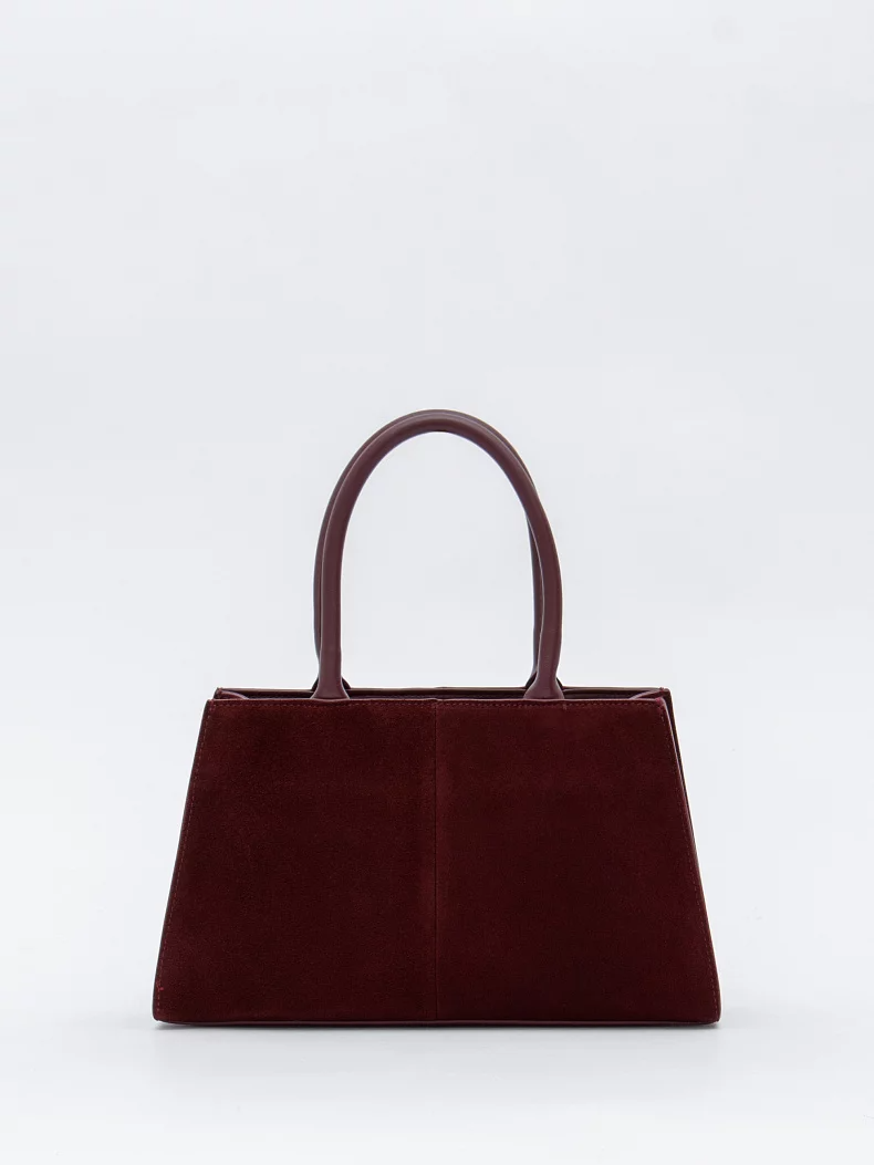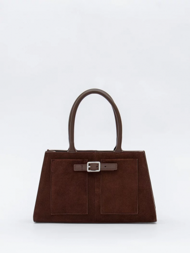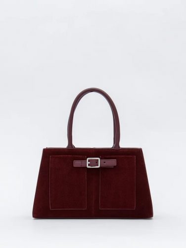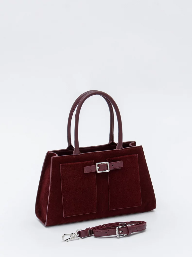 Компактная модель, выполнена из натуральной замши. Декорирована ремнем на корпусе. Дополнена серебристой фурнитурой. Данная модель закрывается на молнию. Носится в руке за встроенные ручки или на плече. В комплекте имеется съемный ремень с регулировкой длины. Каркас жесткий.