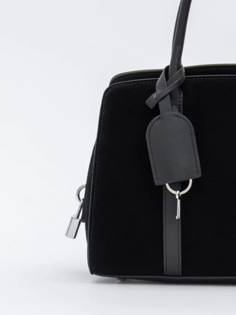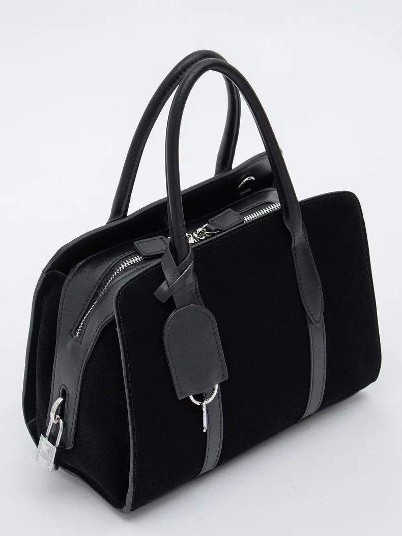 Базовая сумка, выполнена из замши. Декорирована брелоком. Дополнена серебристой фурнитурой. Данная модель закрывается на молнию. Каркас полужесткий. Носится в руке за встроенные ручки или на плече. В комплекте имеется съемный ремень с регулировкой длины. На дне предусмотрены ножки.