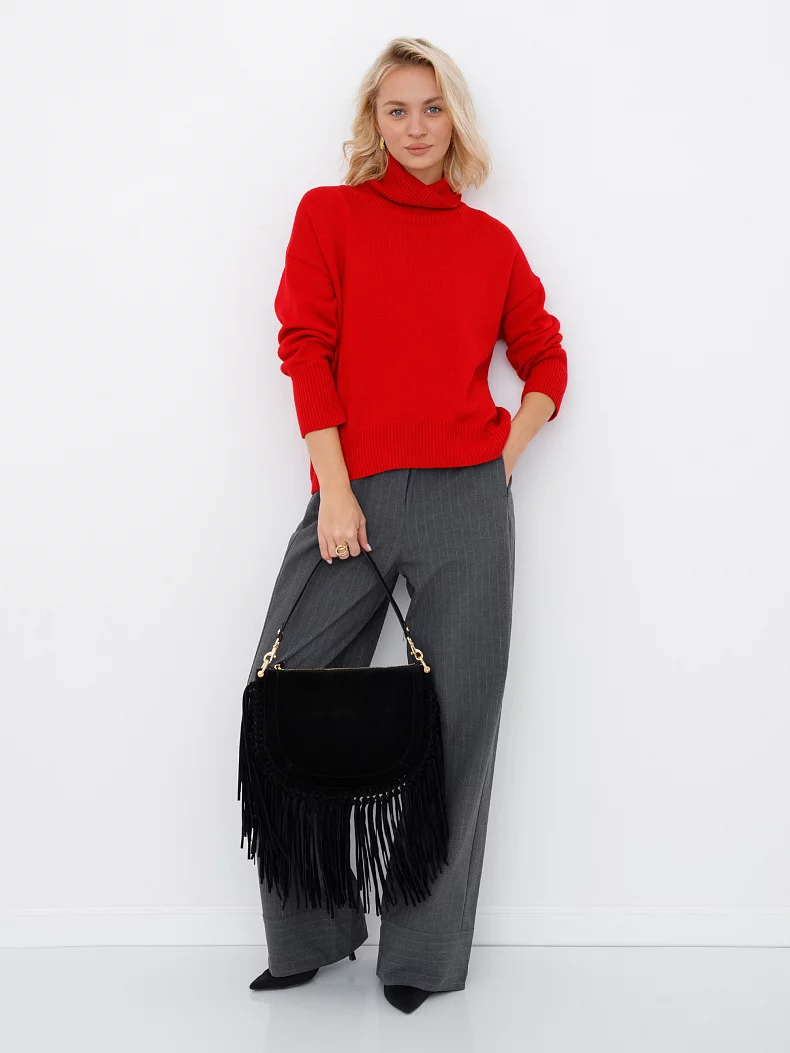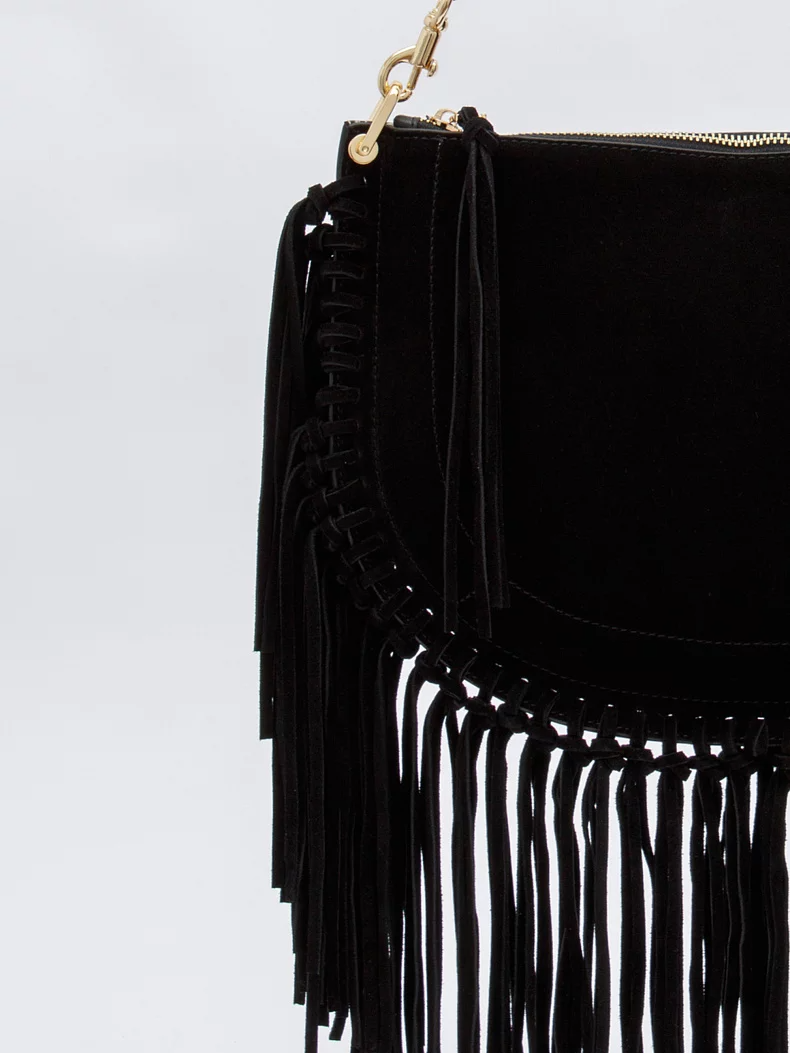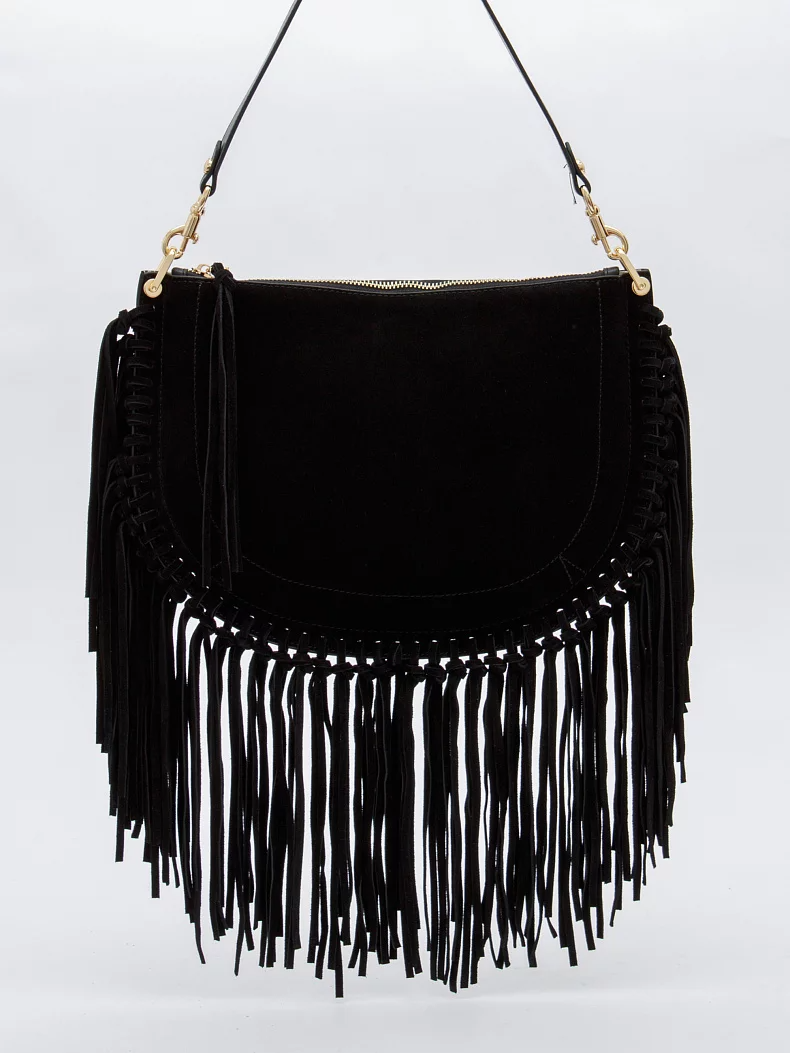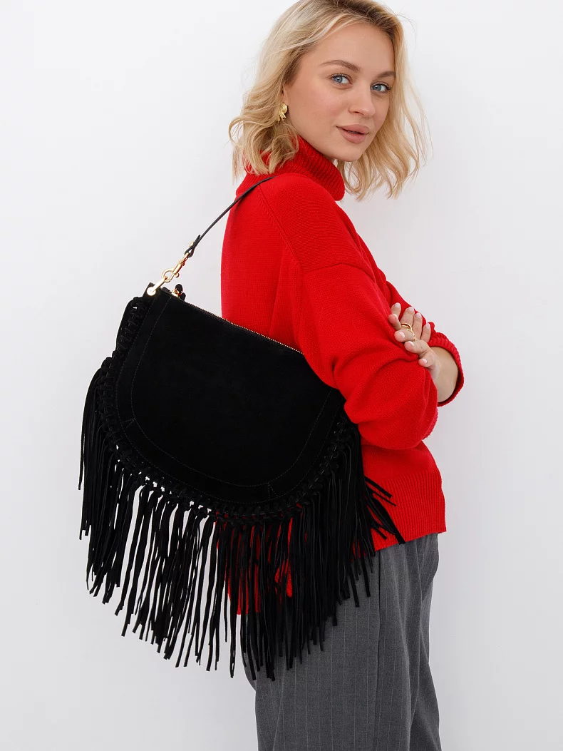 Эффектная модель, выполнена из замши. Декорирована бахромой. Дополнена золотистой фурнитурой. Данная модель закрывается на молнию Каркас мягкий. Носится в руке за съемную удлиненную ручку или на плече. В комплекте имеется съемный ремень с регулировкой длины.