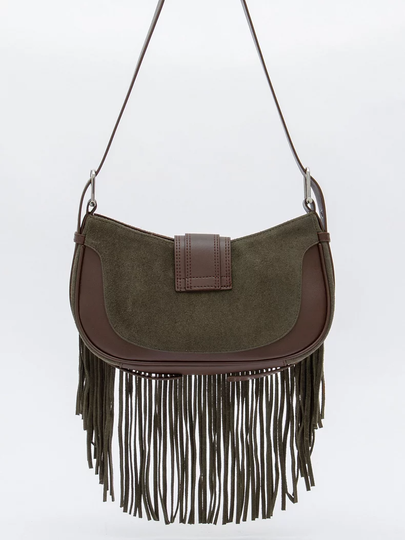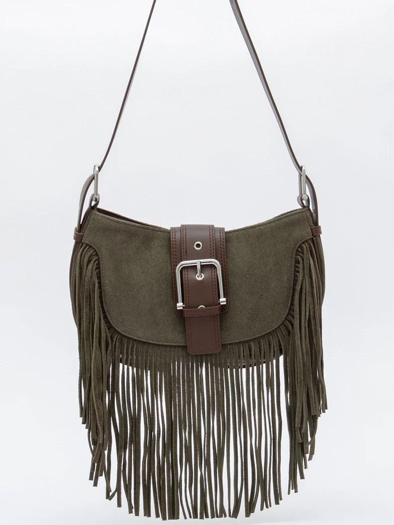 Эффектная модель, выполнена из замши. Декорирована бахромой. Дополнена серебристой фурнитурой. Данная модель закрывается на хлястик. Каркас мягкий. Носится в руке или на плече. Встроенный ремень регулируется по длине.