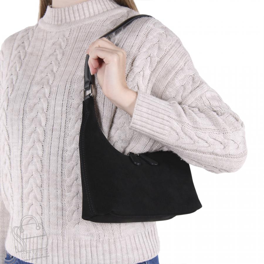 Сумка в форме мешок, выполнена из замши.  Дополнена серебристой фурнитурой. Данная модель закрывается на молнию. Каркас мягкий. Носится через плечо и за ручку.