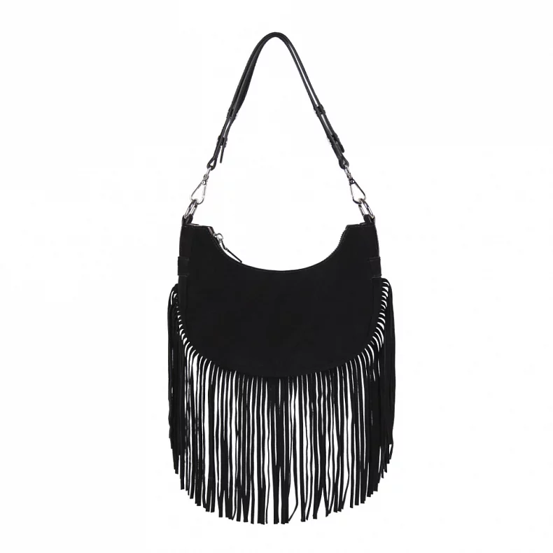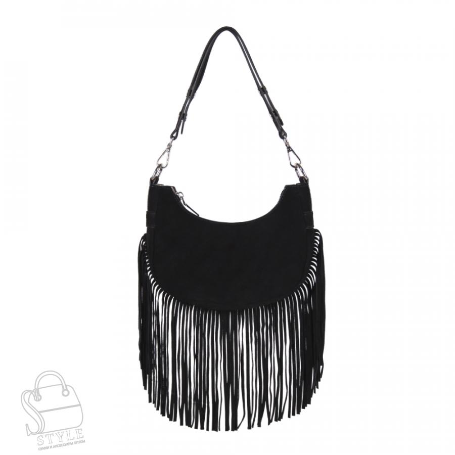 Эффектная модель, выполнена из замши. Декорирована бахромой.  Дополнена серебристой фурнитурой. Данная модель закрывается на молнию. Каркас полужесткий. Носится в руке за короткую ручку или на плече. В комплекте имеется съемный ремень с регулировкой длины. Каркас полужесткий.