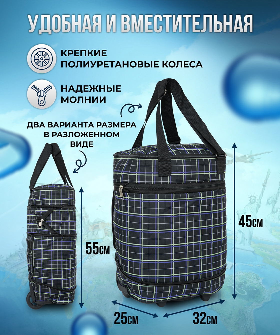 — Сумка оснащена двумя полиуретановыми колесами на скользящих подшипниках, которые создают бесшумное скольжение.