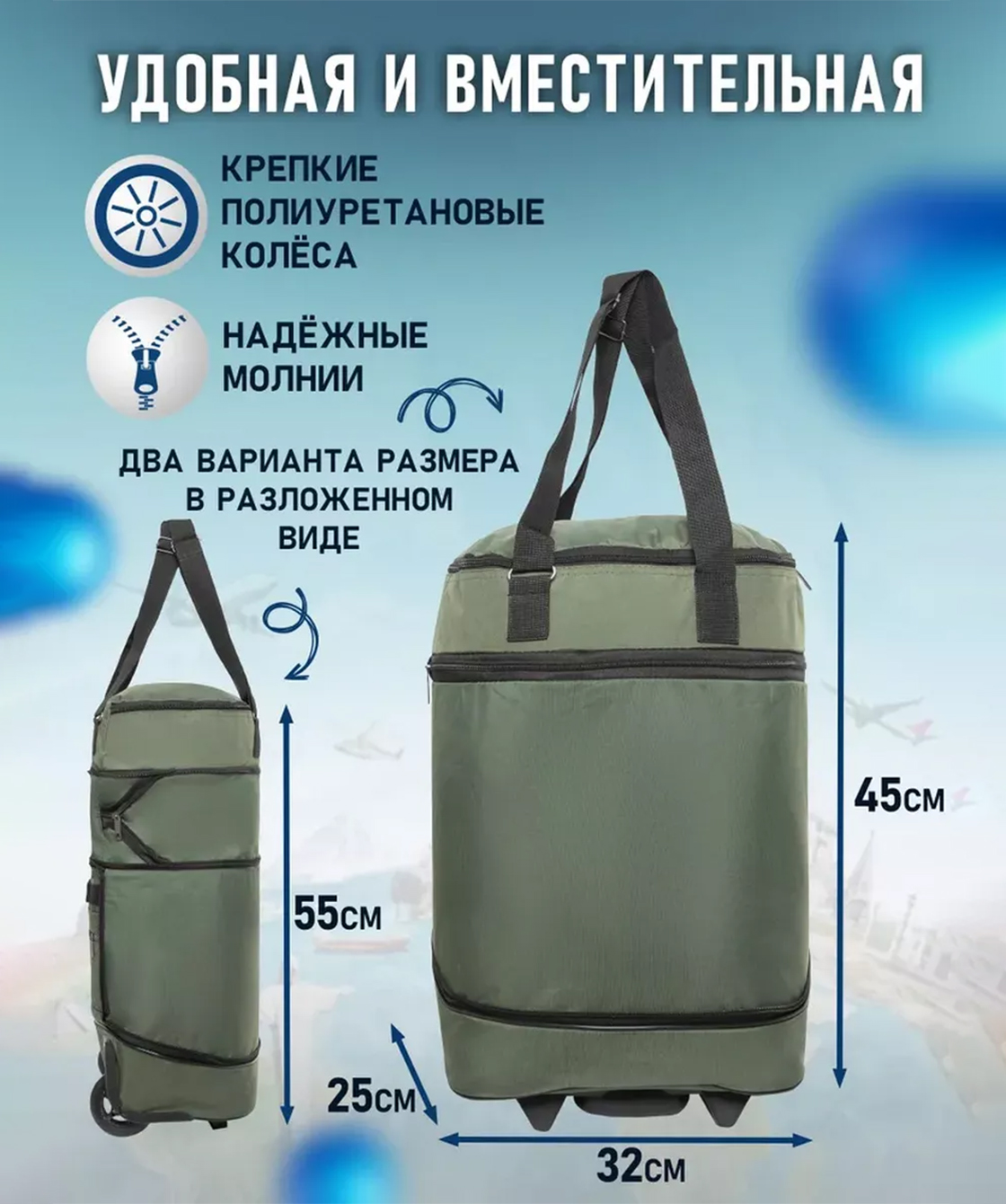 — Сумка оснащена двумя полиуретановыми колесами на скользящих подшипниках, которые создают бесшумное скольжение.