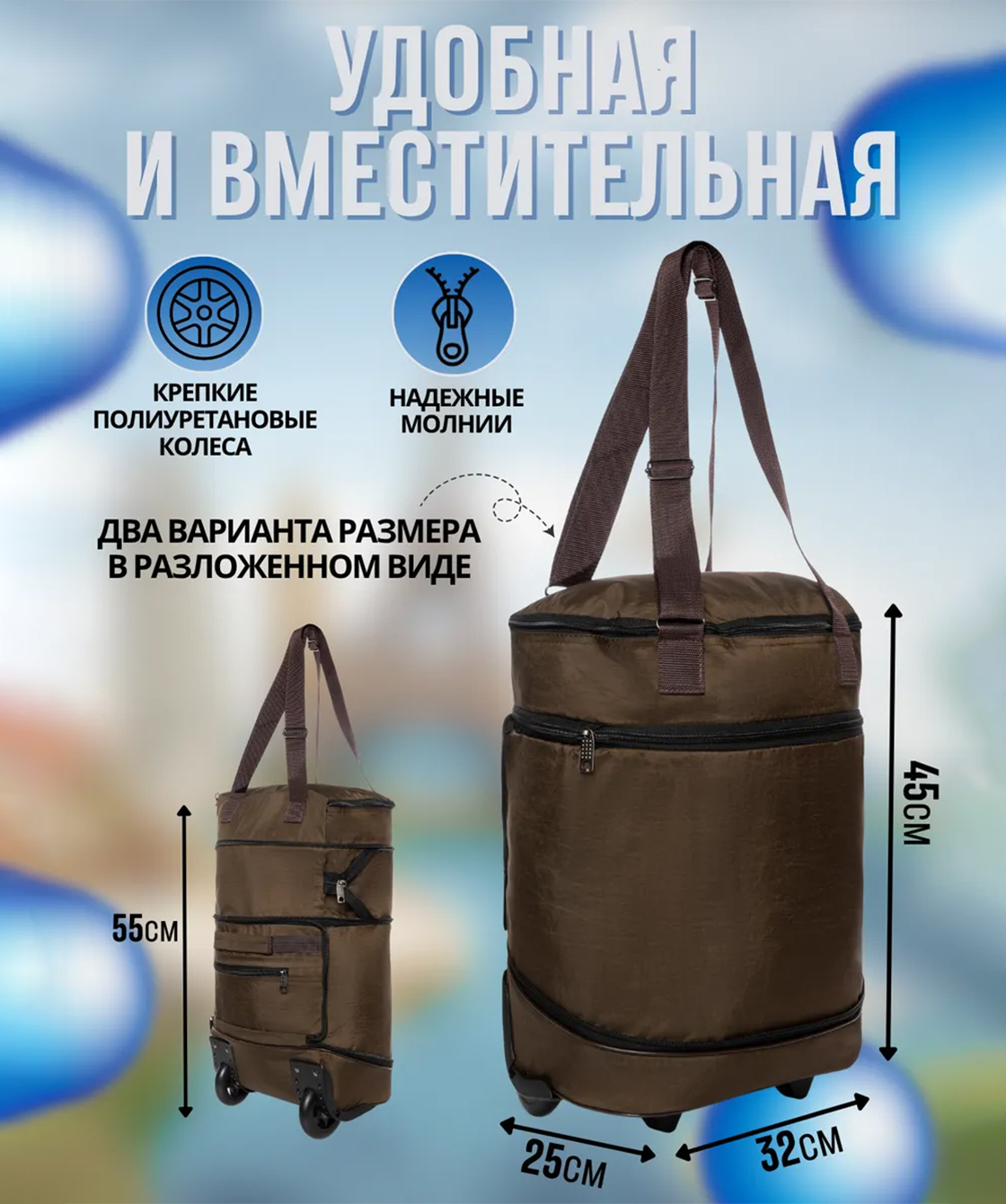 — Сумка оснащена двумя полиуретановыми колесами на скользящих подшипниках, которые создают бесшумное скольжение.