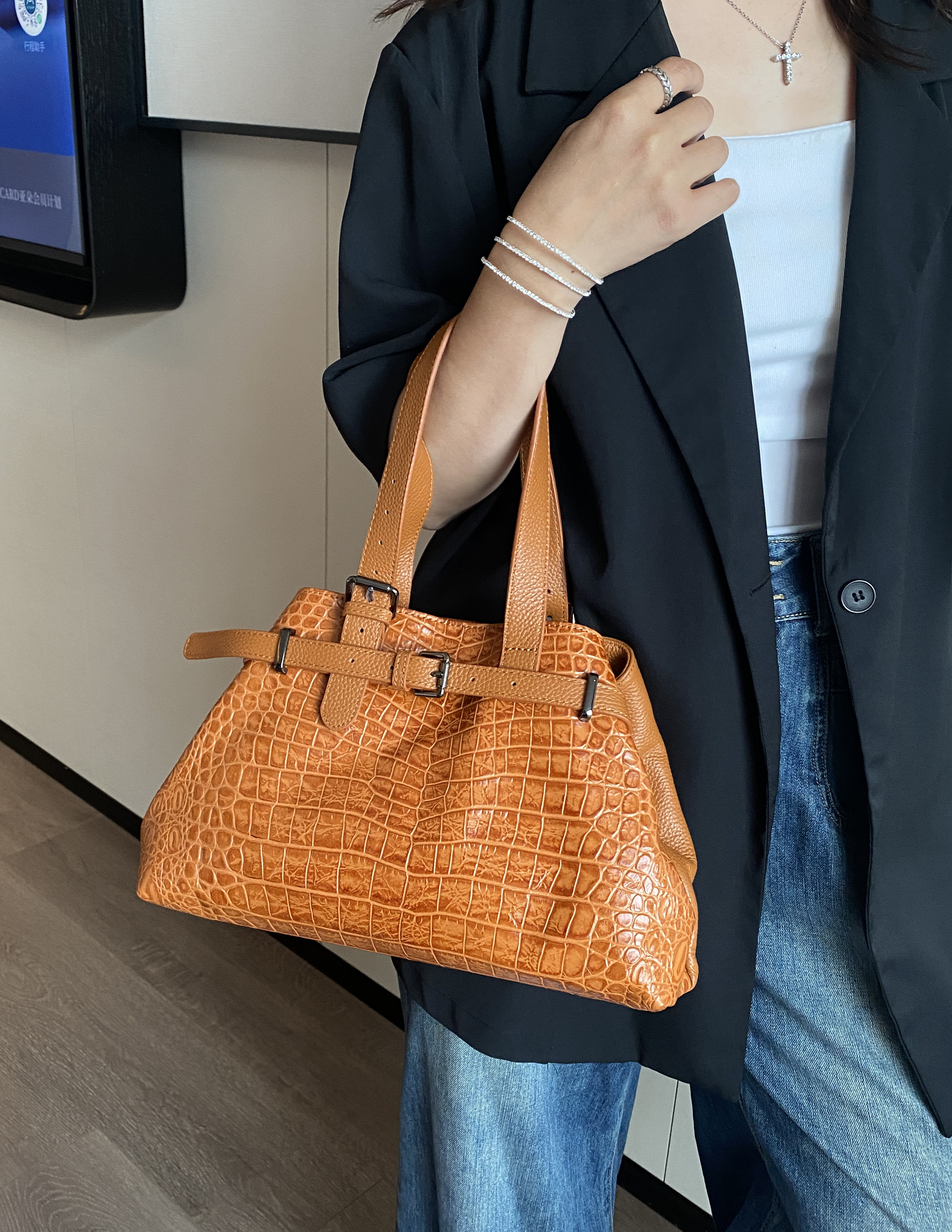 Трансформация формы: Благодаря изящному карабину, расположенному сбоку, вы сможете легко изменить форму сумки, адаптируя ее под ваш образ и настроение.