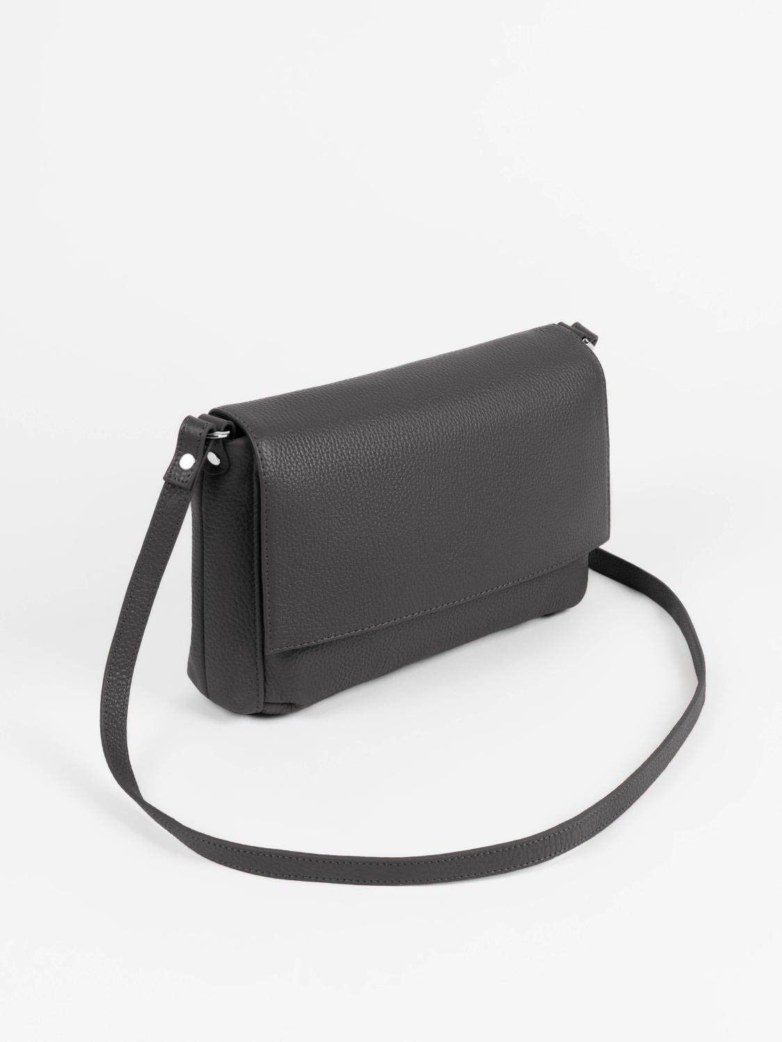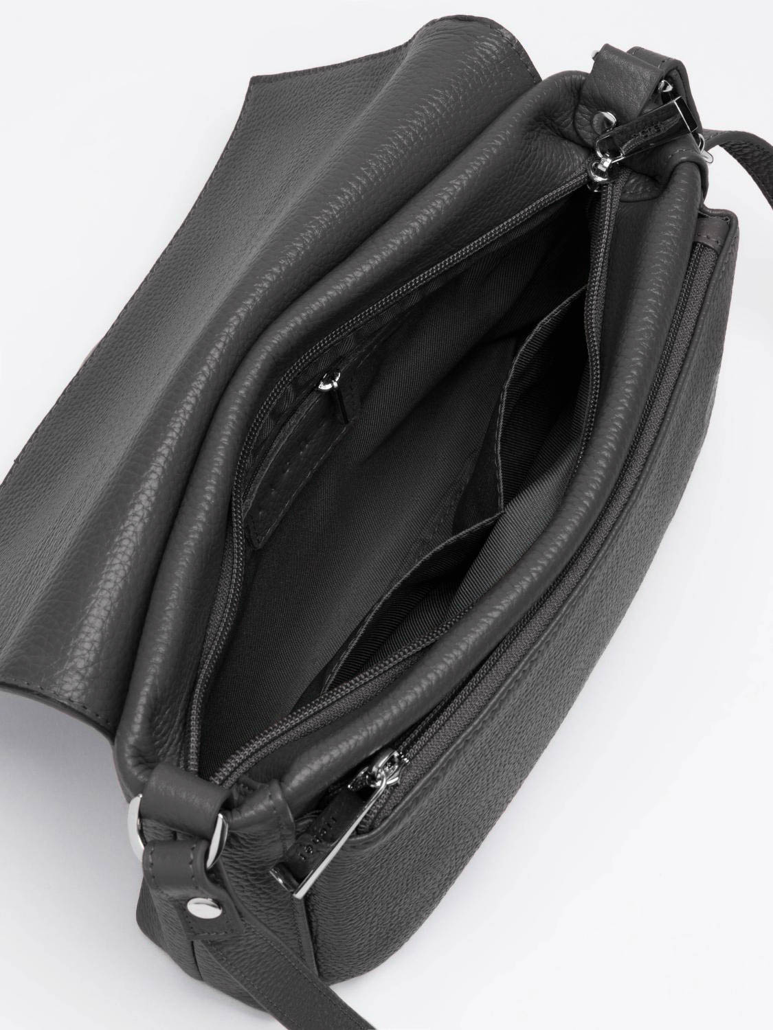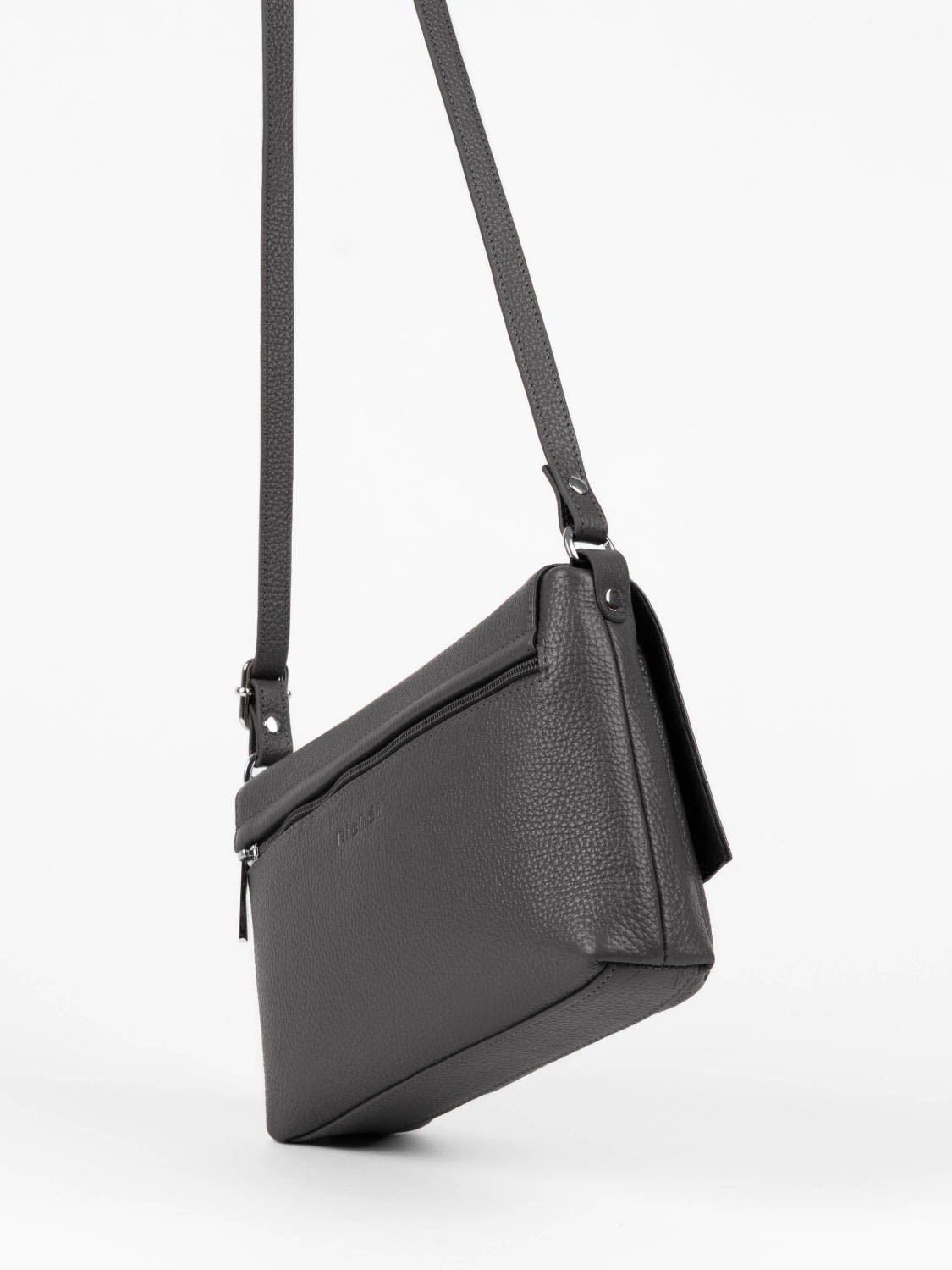 Стильная сумочка кросс-боди с двумя автономными отделами, которые закрываются на молнию и клапан с двумя магнитными кнопками, носится на плече на длинном ремне.