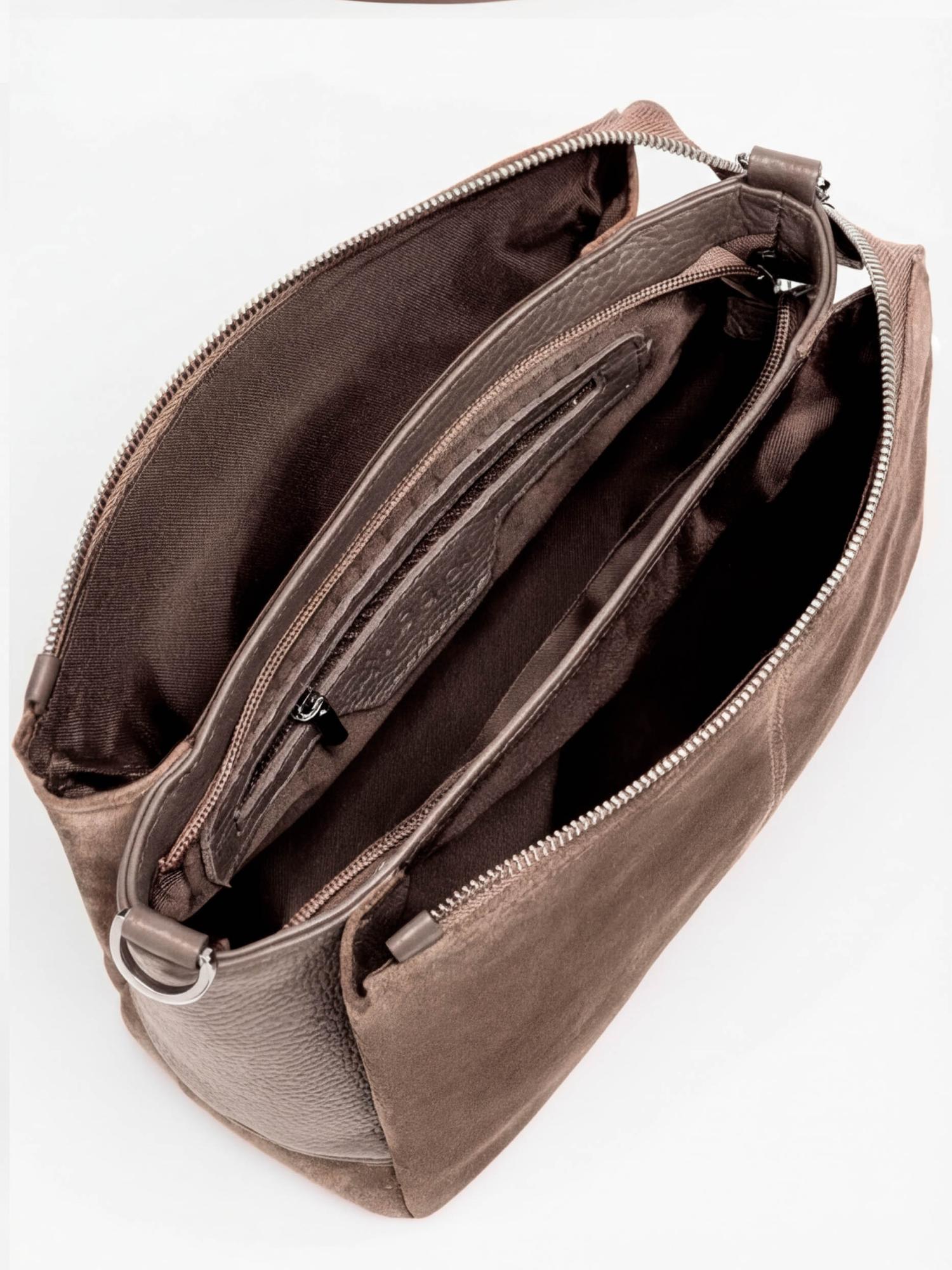 Изящная сумочка из мягкой кожи, закрывается на молнию, с тремя автономными отделами. Носится в руке или через плечо.