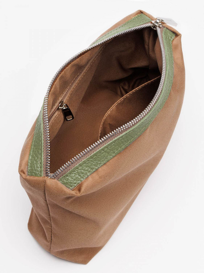 Внутри: текстильная косметичка на молнии, внутри которой вместительный карман на молнии и один открытый кармашек.