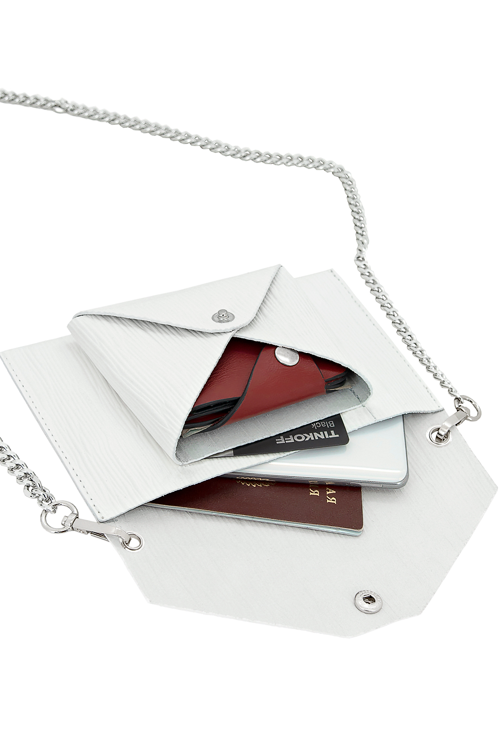 Сумка женская со съемным ремнем- цепочкой через плечо. Внутри сумки отделение куда помещается мобильный телефон, паспорт и водительские документы. На передней стенке под клапаном два кармана, один для пластиковых карт и второй для разных мелочей: ключи, денежные купюры. Идеальный вариант для поездок, компактная и стильная сумка через плечо для документов. 19.5 х12х2 см