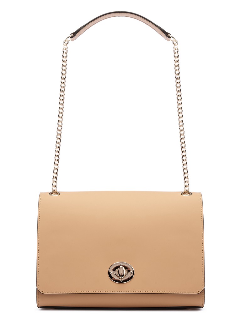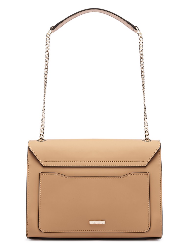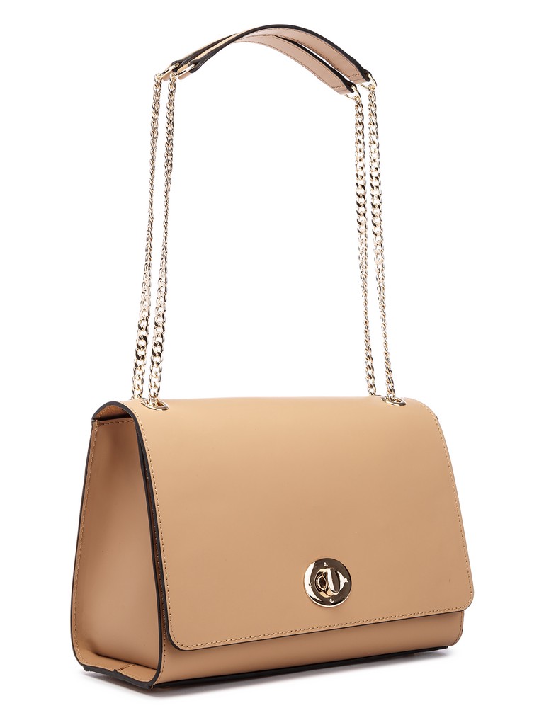 Женская сумка торговой марки Eleganzza из натуральной кожи. Модель закрывается клапаном на замок. Содержит внутри один отдел, в котором имеются карман на молнии и два открытых кармана. На задней стенке есть открытый карман. Высота ручки из металлической цепочки со вставкой из кожи - 60 см. Ручка трансформируется из одной в две. Высота двух ручек - 30 см. Модель имеет ножки на дне. Не вмещает формат А4.